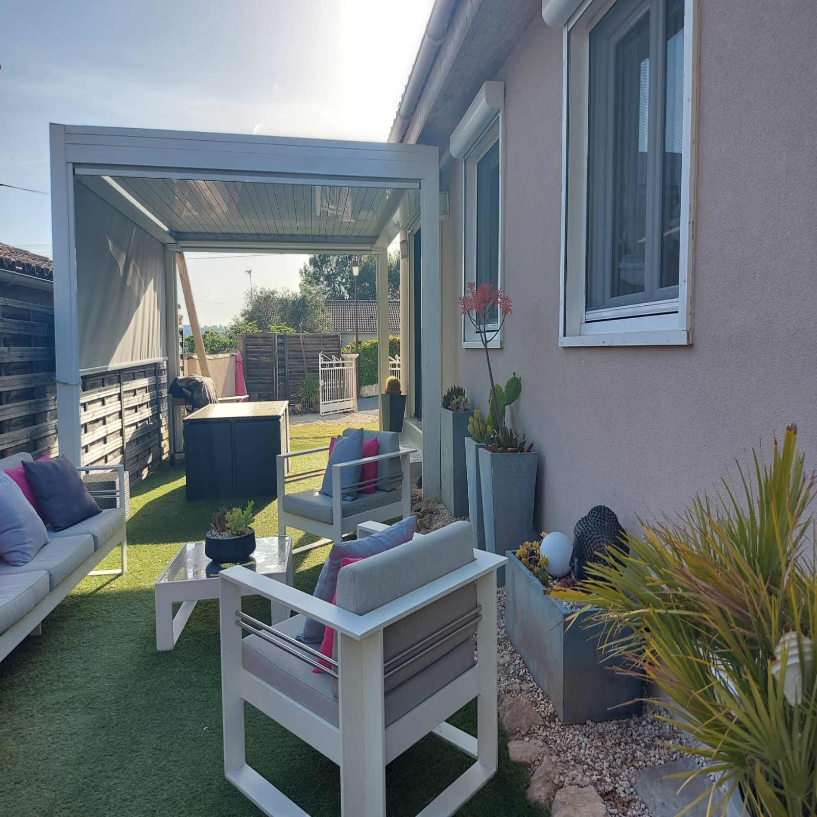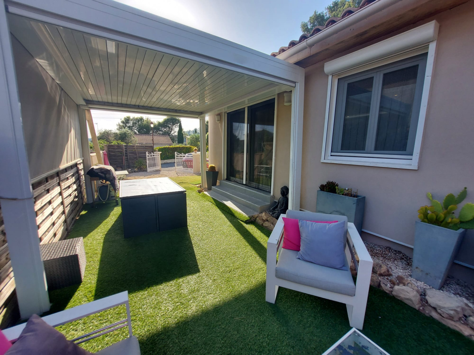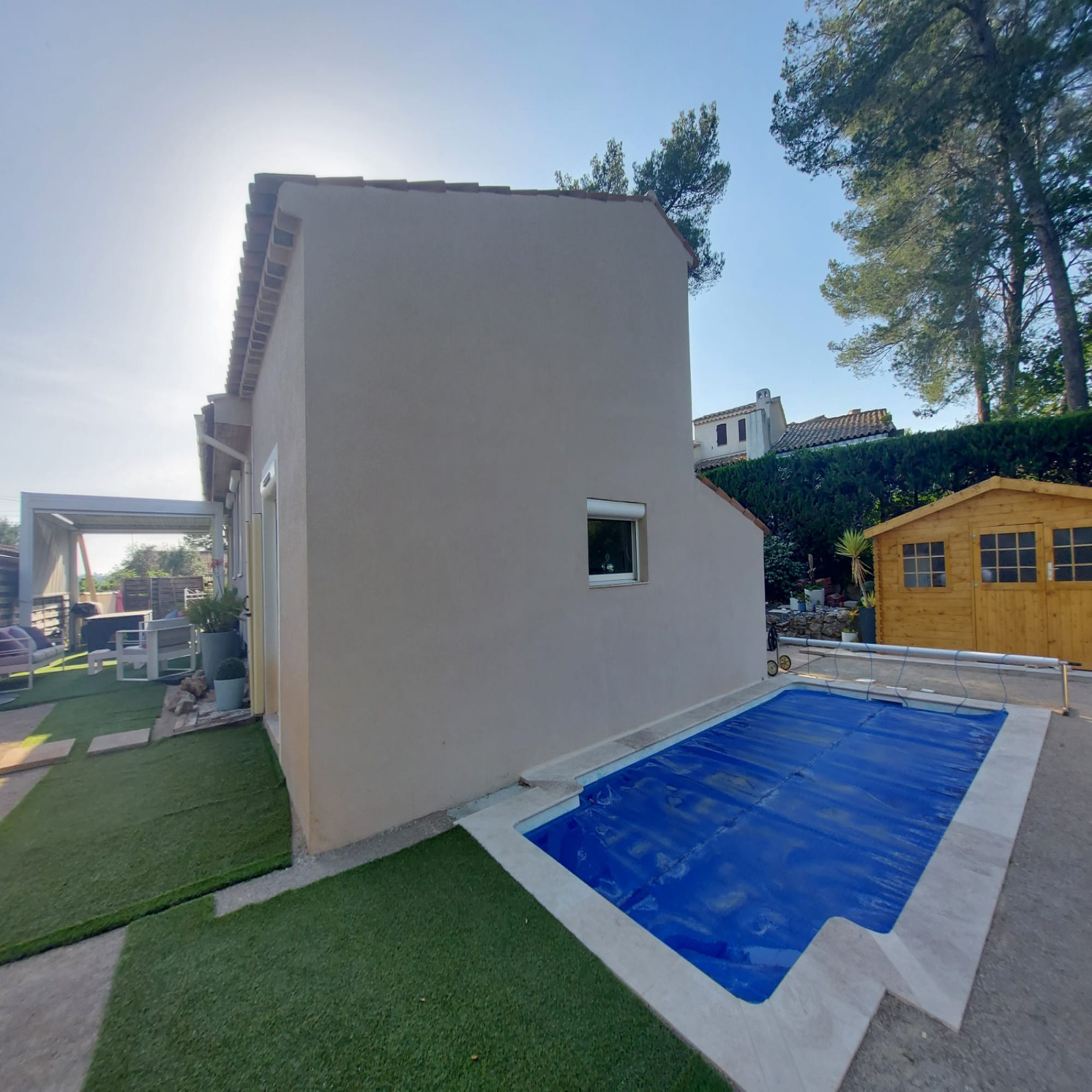 Côté jardin, une terrasse sud/ouest avec sa pergolas bioclimatique, une piscine au chlore 6x3m, un jardin intimiste facile d'entretien et un chalet en bois pour le rangement.