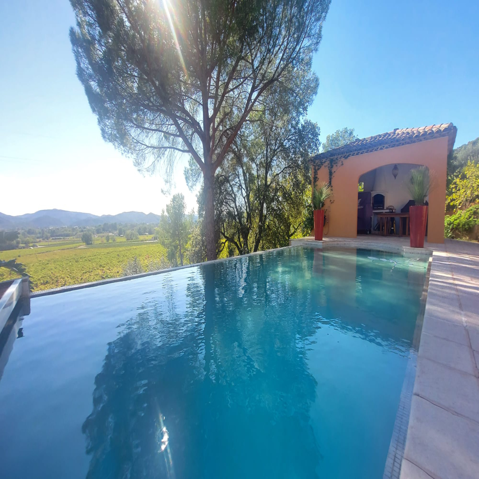 La propriété entièrement clôturée offre deux carports dont un grand protégé, une cave de 38m2, un forage, un superbe piscine au sel à débordement avec sa ligne d'eau parfaitement alignée mettant en avant ce paysage féérique.