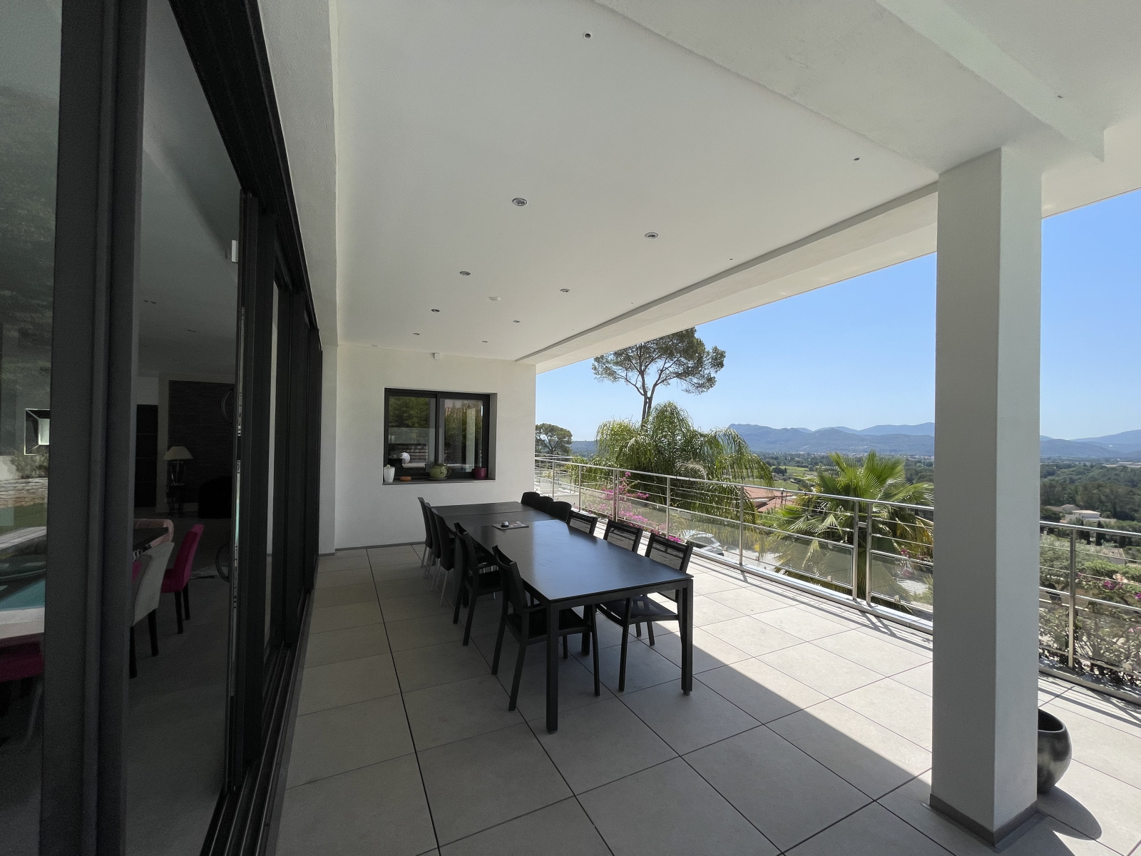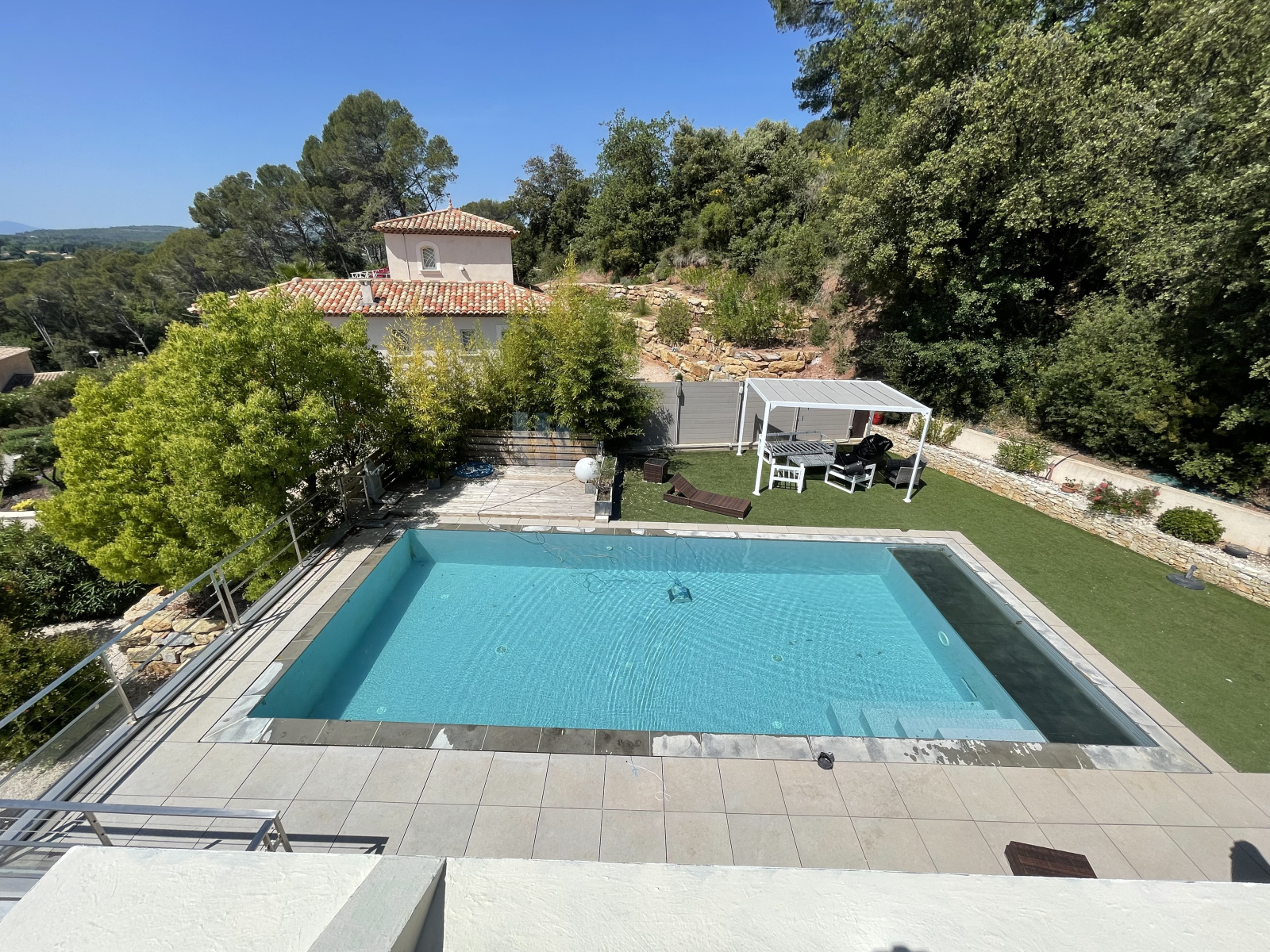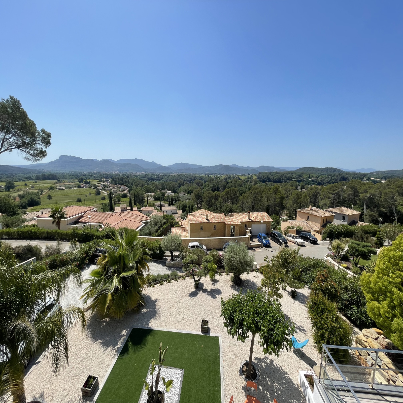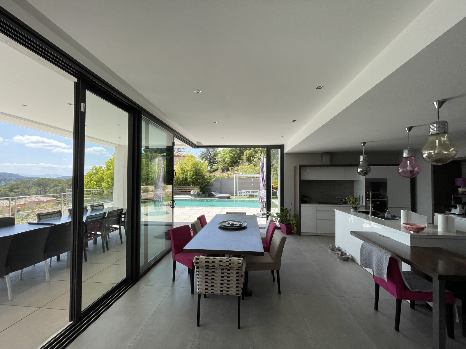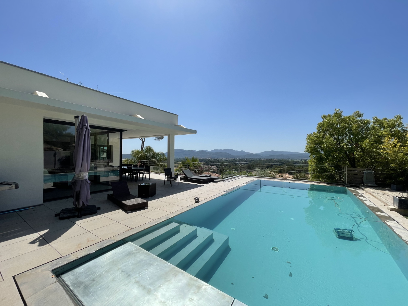 VENDU - Extender Immobilier vous présente cette somptueuse villa contemporaine récente. Édifiée sur un terrain clos de 1700 m², elle saura vous séduire par son exposition plein sud et sa vue époustouflante sur l'Estérel et le Massif des Maures. Dès son entrée, vous bénéficiez d'une magnifique pièce de vie baignée de lumière, donnant accès sur une terrasse de 200 m², laissant apparaître de magnifiques volumes décloisonés, sa cuisine entièrement aménagée et équipée, son cellier ainsi que sa suite parentale de 35 m² comprenant salle d'eau, wc et dressing. En rez-de-jardin, elle offre 3 suites parentales avec chacune un accès donnant sur un grand espace extérieur parfaitement paysagé, une salle de sport avec son jacuzzi, une buanderie, une cave et un garage d'environ 70 m². Une dimension très fonctionnelle et qualitative est ajoutée à cette propriété via des prestations modernes telles que, une somptueuse piscine à débordement chauffée, un toit-terrasse accessible pouvant être aménagé, un chauffage au sol par pompe à chaleur réversible ainsi qu'une climatisation, des baies à galandages. Elle s'inscrit dans un mode de vie unique, tout en étant proche des commerces, des écoles, ainsi que du golf de Saint Endréol.