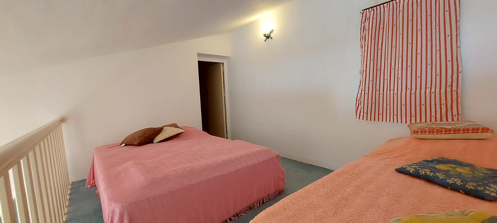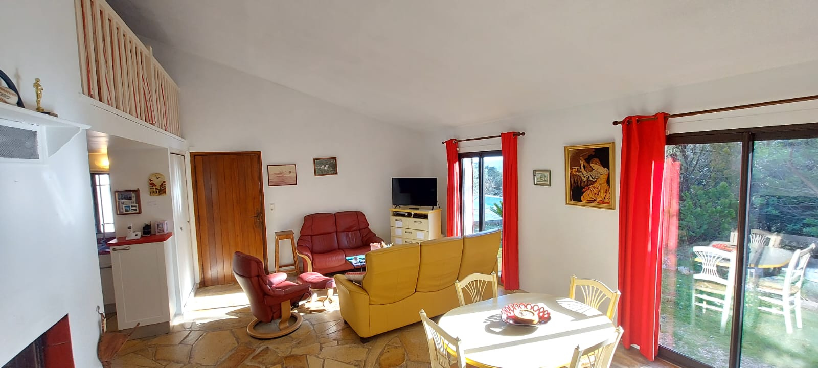 La villa est composée de 2 bâtisses reliées par une terrasse. Le premier bâtiment propose un séjour salon avec une cheminée insert, une cuisine équipée ouverte, un cellier, une salle d'eau, un wc et un coin nuit en mezzanine. Le second bâtiment offre trois chambres avec placard, une mezzanine, une salle de bains et un wc.