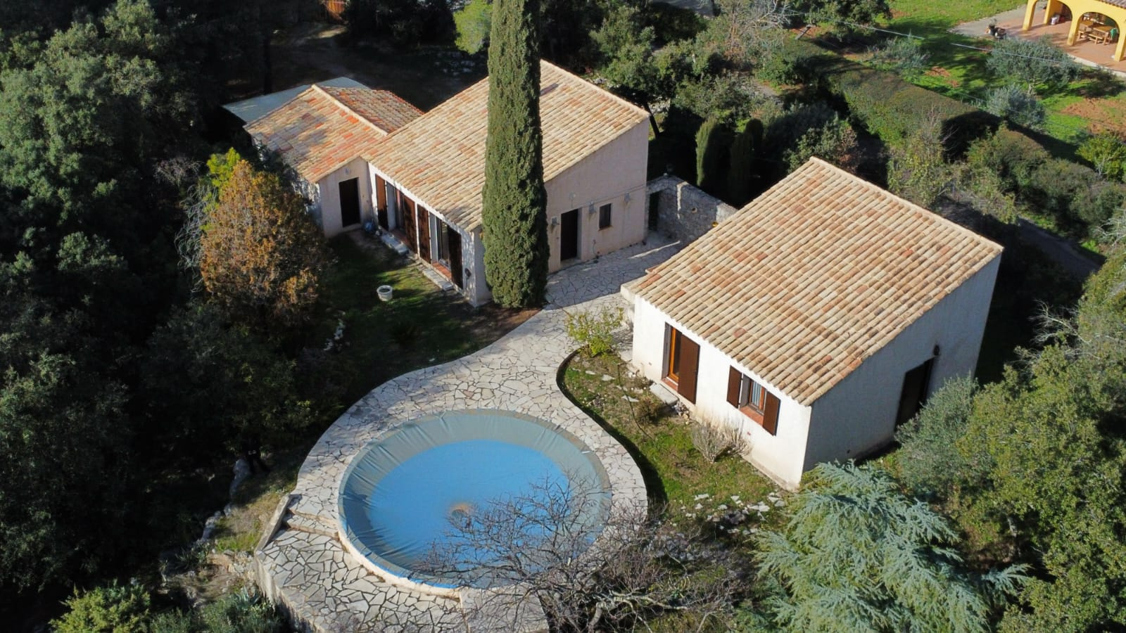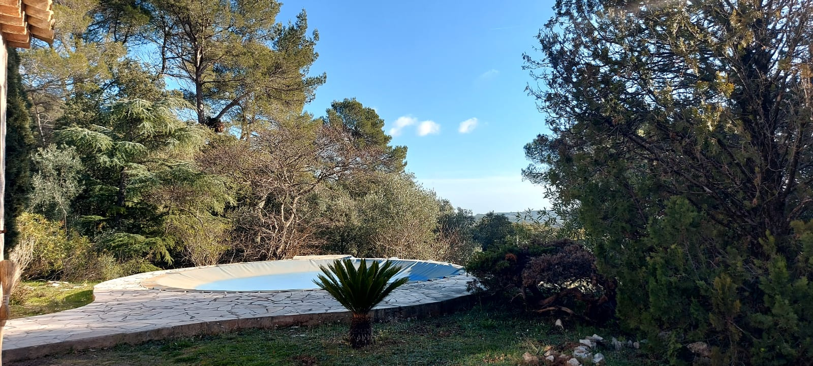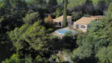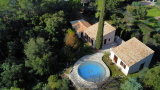 Une pinède parsemée de cyprès chandelle enveloppe la villa et ses dépendances. Une belle piscine chauffée en forme arrondie surplombe le parc. La vue est panoramique.