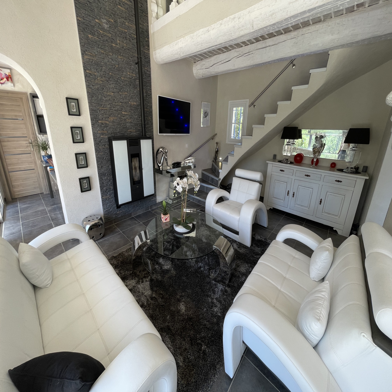Depuis l'espace de vie, venez profiter d'une vue panoramique sur l'espace boisé classé. Son exposition plein sud ainsi que ses grandes ouvertures remplissent de lumière tous les espaces de cette maison. Au rez de chaussée, un séjour cathédral avec un poêle à granule illustre parfaitement le caractère chaleureux et authentique des lieux, une cuisine ouverte sur le salon/séjour aménagée et équipée, une terrasse avec une pergola, une seconde ombragée. Dans la continuité une suite parentale, une chambre (aménagée en bureau) avec placard. L'étage laisse découvrir une suite parentale avec dressing (ou seconde chambre) donnant accès à une terrasse surplombant la forêt.