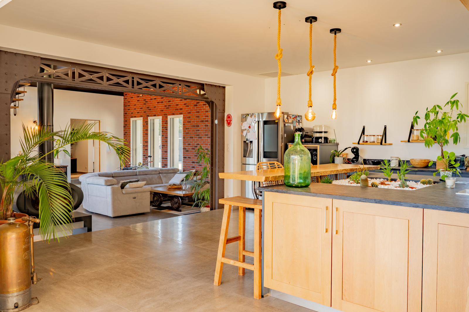 L'entrée s'ouvre sur un superbe séjour-salon de 50m2 traversant bénéficiant d'une remarquable hauteur sous plafond et d'une mezzanine de 26m2 aménagée en salle de jeux... on y retrouve un style métallique façon Eiffel réalisé par Des Compagnons. La cuisine dinatoire de 35m2, pièce maîtresse de la maison est équipée d'un îlot central, un plan de travail en granit, un électroménager haut de gamme et de nombreux rangements fonctionnels. Un accès direct au garage facilite le quotidien.