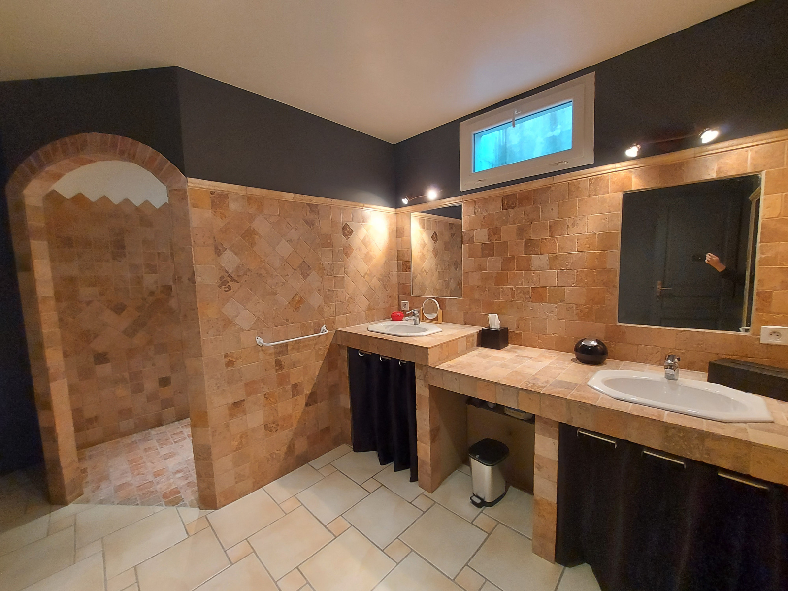 Elle est composée d'une entrée avec wc invités, un spacieux séjour/salon cathédrale avec cuisine ouverte, une suite avec chambre et sde sur ce même niveau. De grandes baies vitrées à galandage prolongent l'espace de vie sur une belle terrasse et sur l'espace piscine. En empruntant l'escalier on accède à deux autres suites (chambres, sde, et rangements), à un immense dressing et un second wc. Une buanderie entièrement équipée, et un appartement attenant avec chambre, sde, séjour, cuisine et mezzanine complètent ce bien.