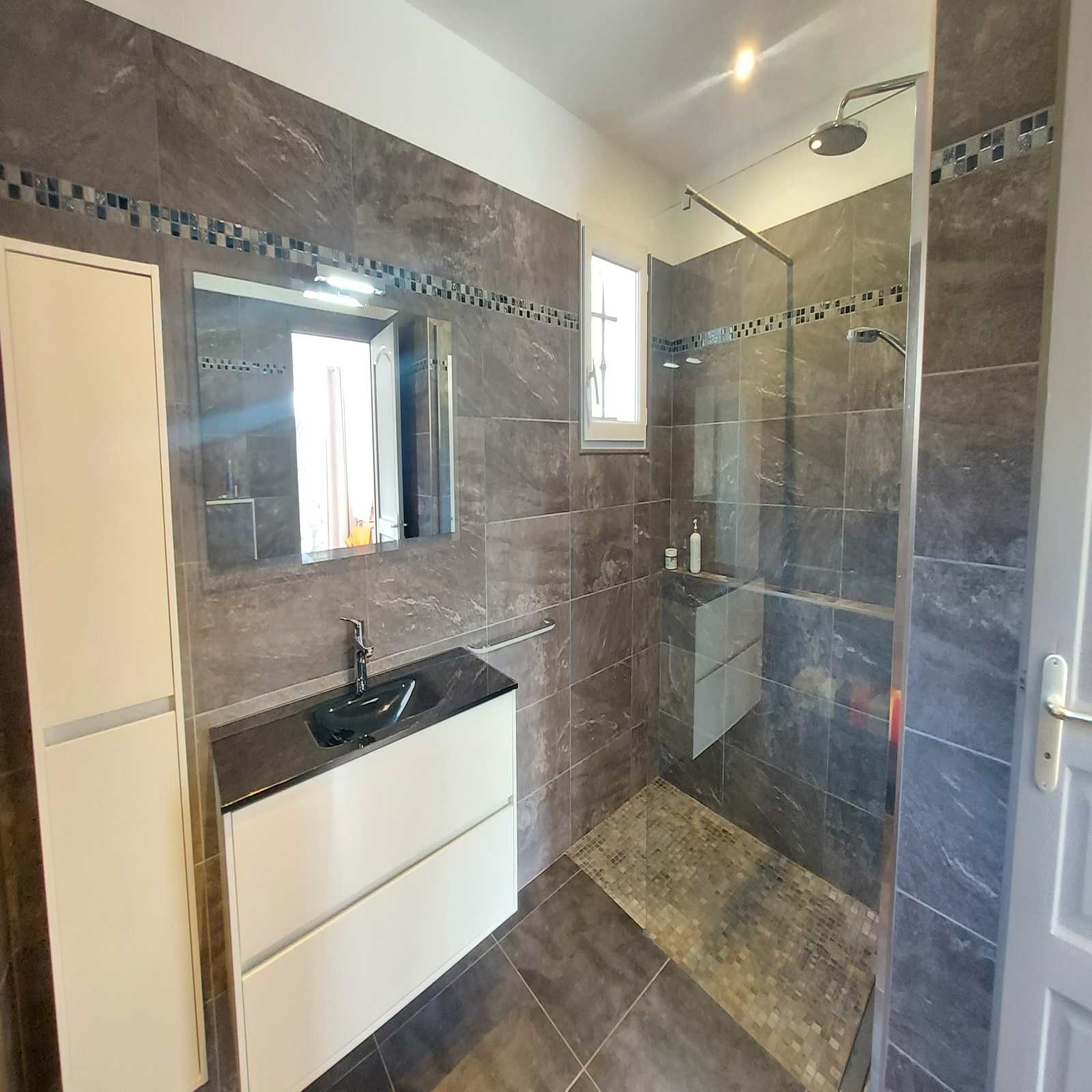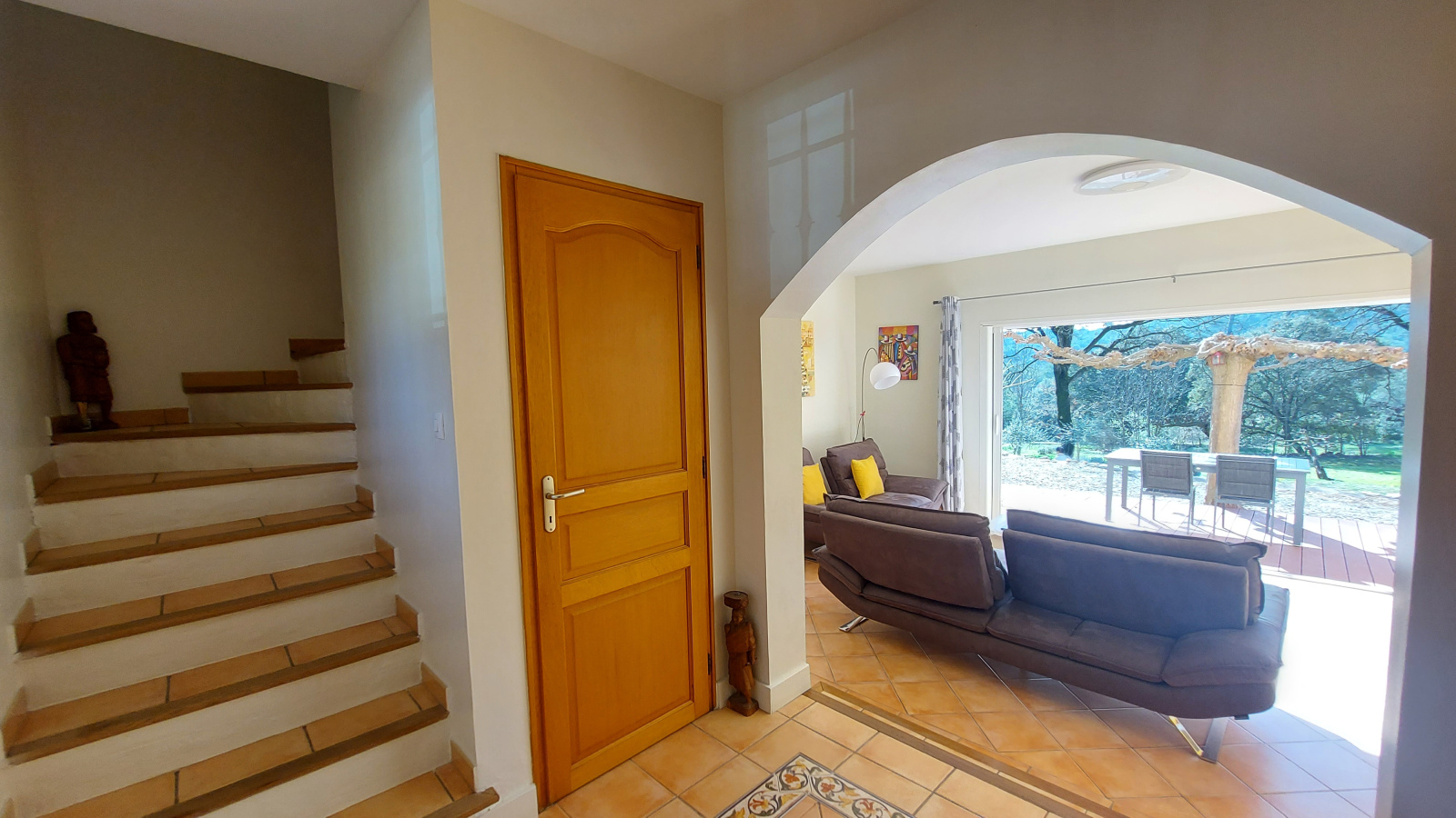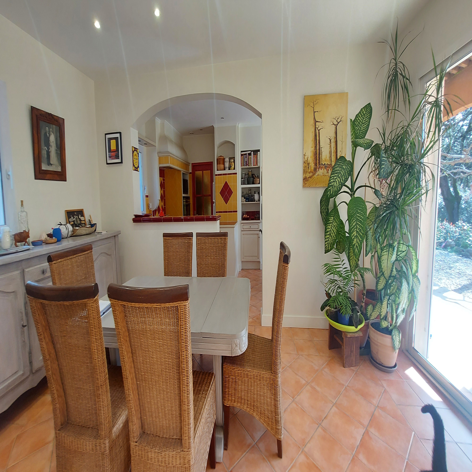 Bien isolée la villa bénéficie de prestations qualitatives comme le chauffage rafraîchissant au sol par pompe à chaleur, de belles menuiseries, des baies à galandages dans le séjour, un forage, une fosse septique aux normes.
