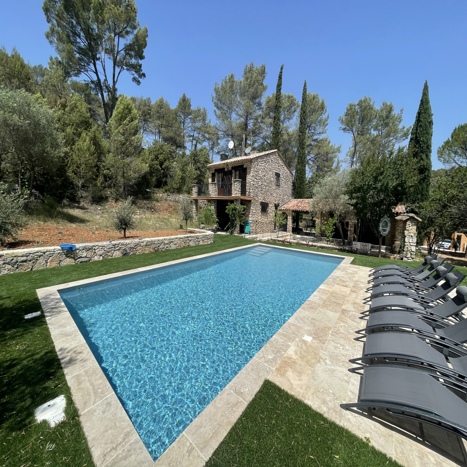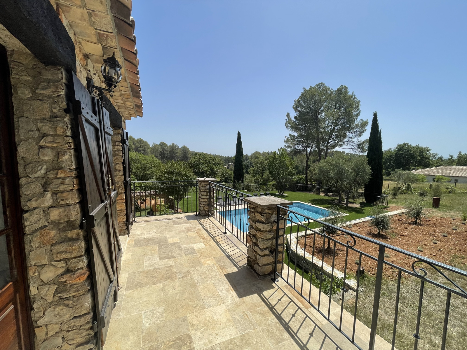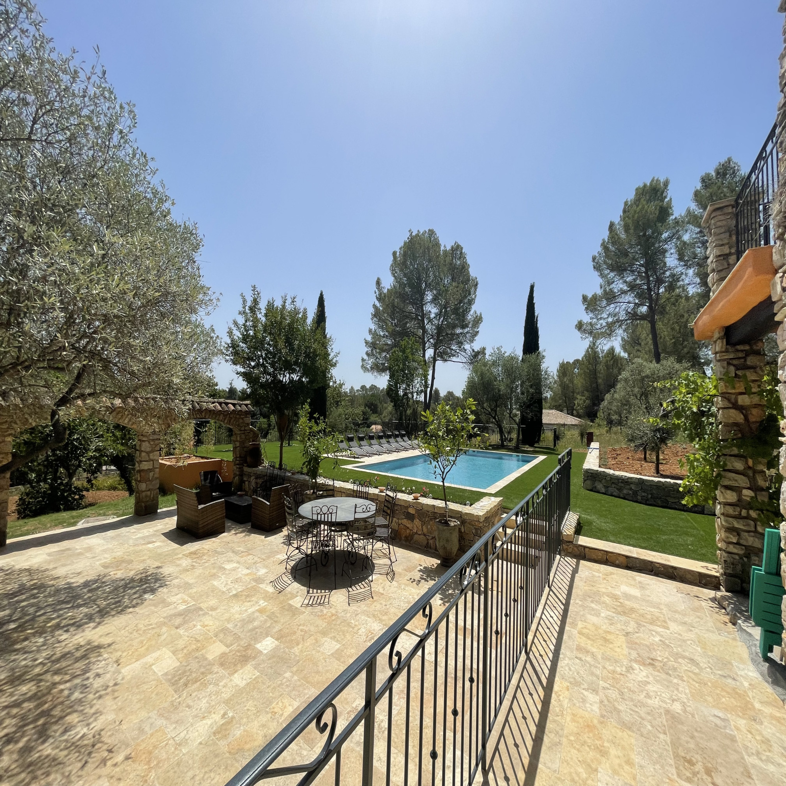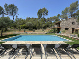 La propriété est entièrement clôturée et complantée de chênes, de cyprès, de pins, de figuiers et de 35 oliviers. Différents espaces de détente sont proposés, une belle piscine de 10x5, 300 m² de terrasse délimitée par des arches en pierre, une cuisine d'été...