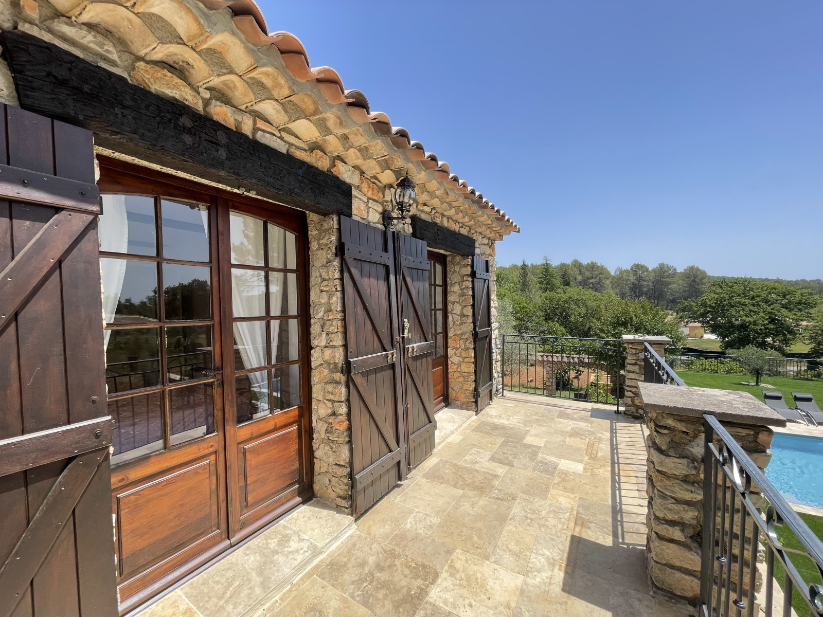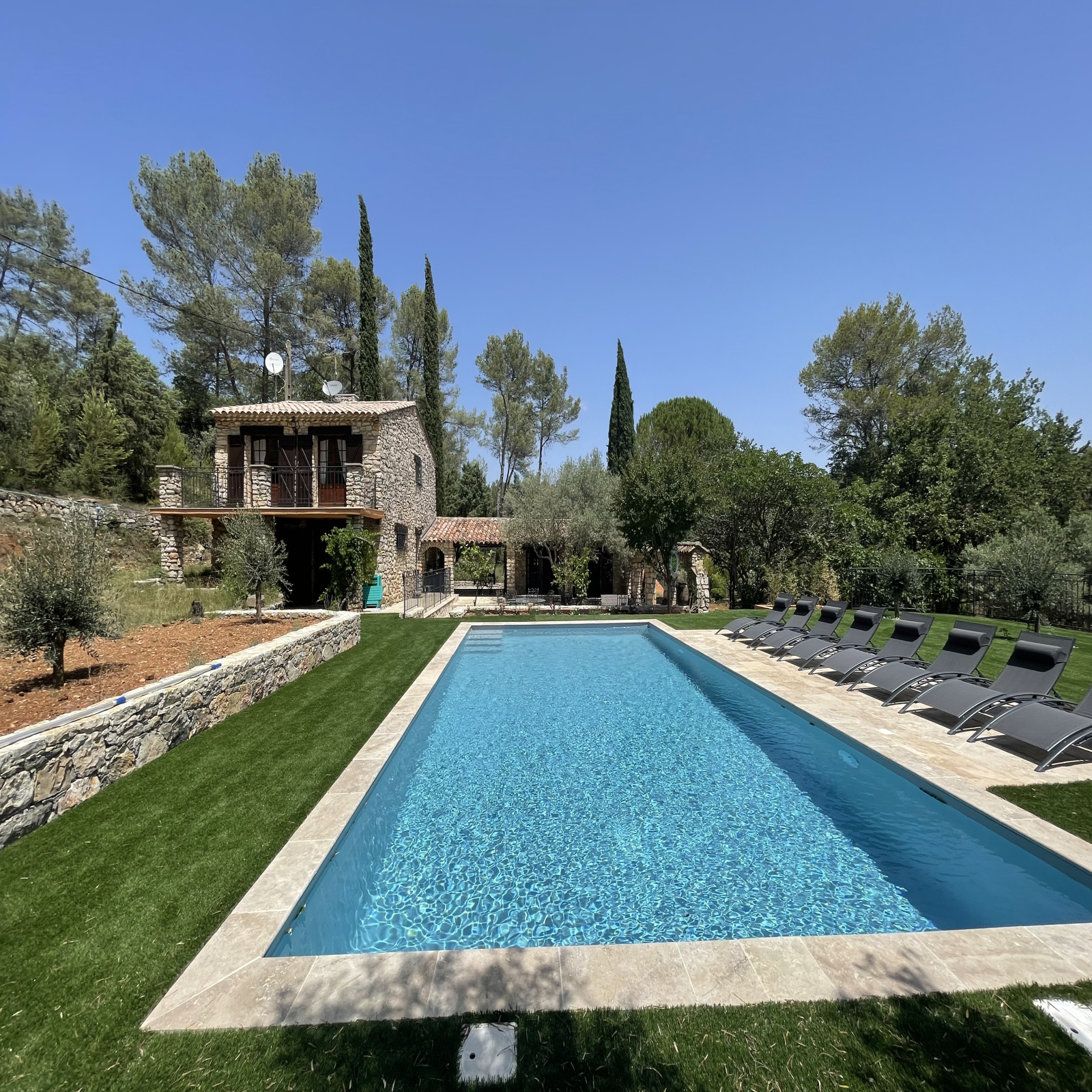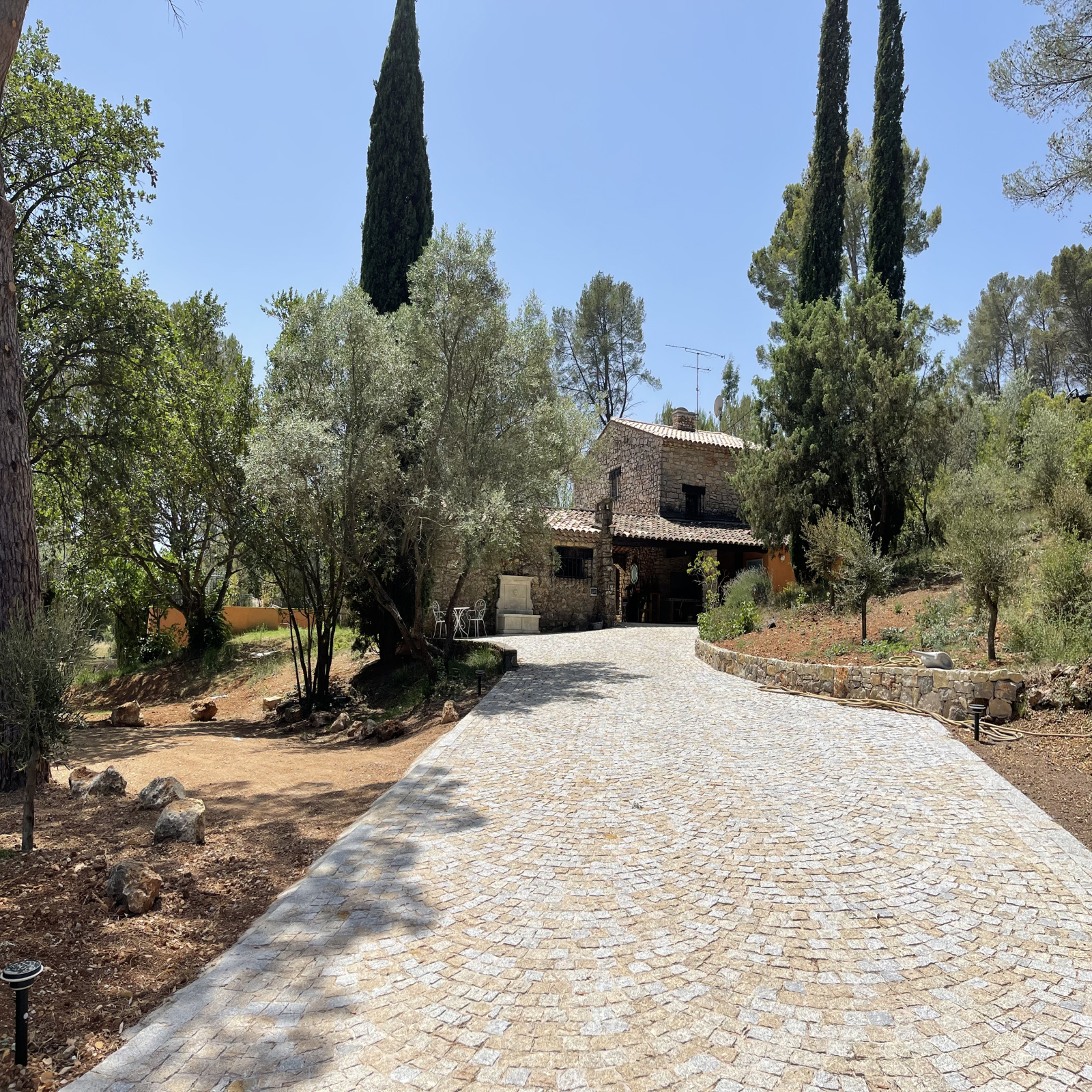 La propriété est entièrement clôturée et complantée de chênes, de cyprès, de pins, de figuiers et de 35 oliviers. Différents espaces de détente sont proposés, une belle piscine de 10x5, 300 m² de terrasse délimitée par des arches en pierre, une cuisine d'été...