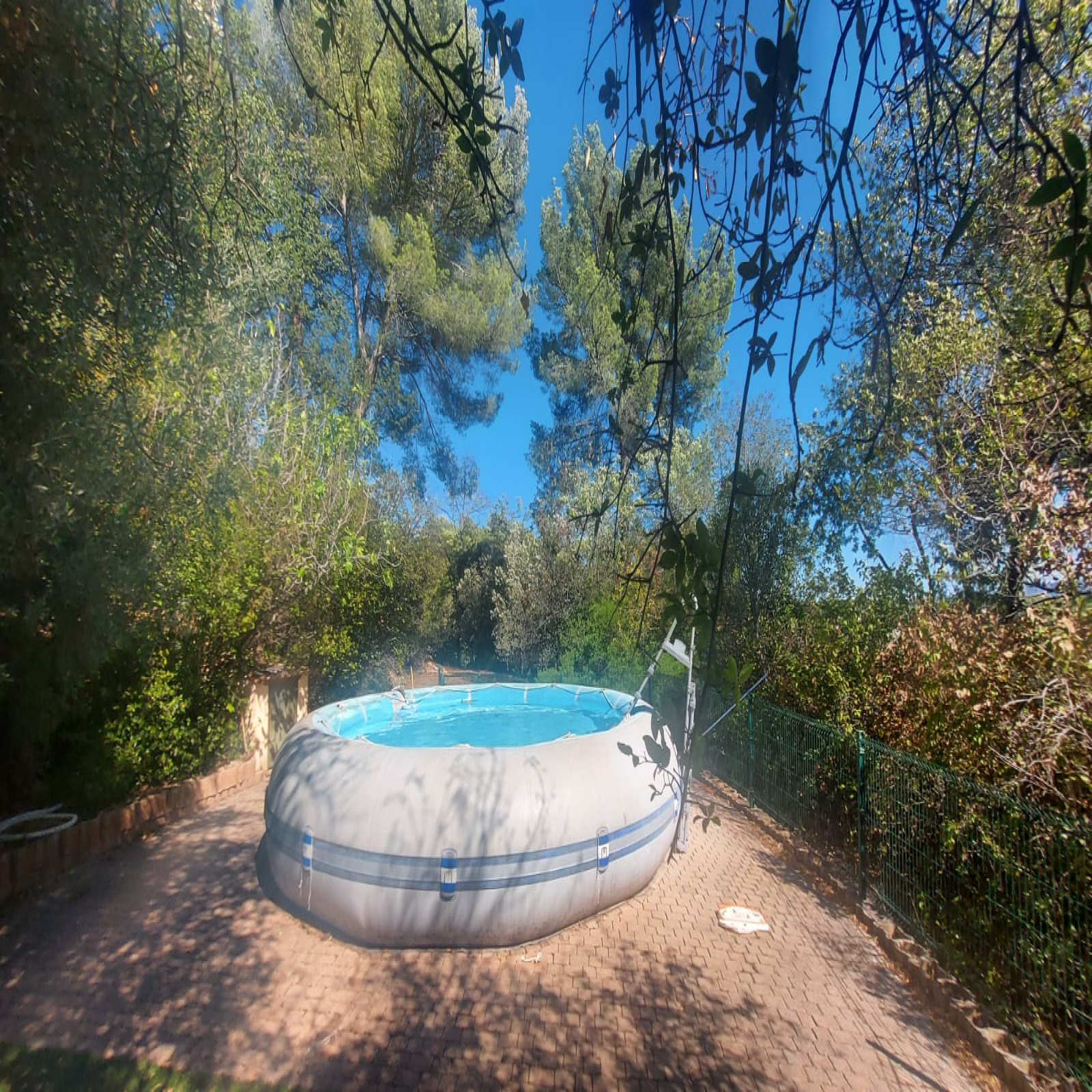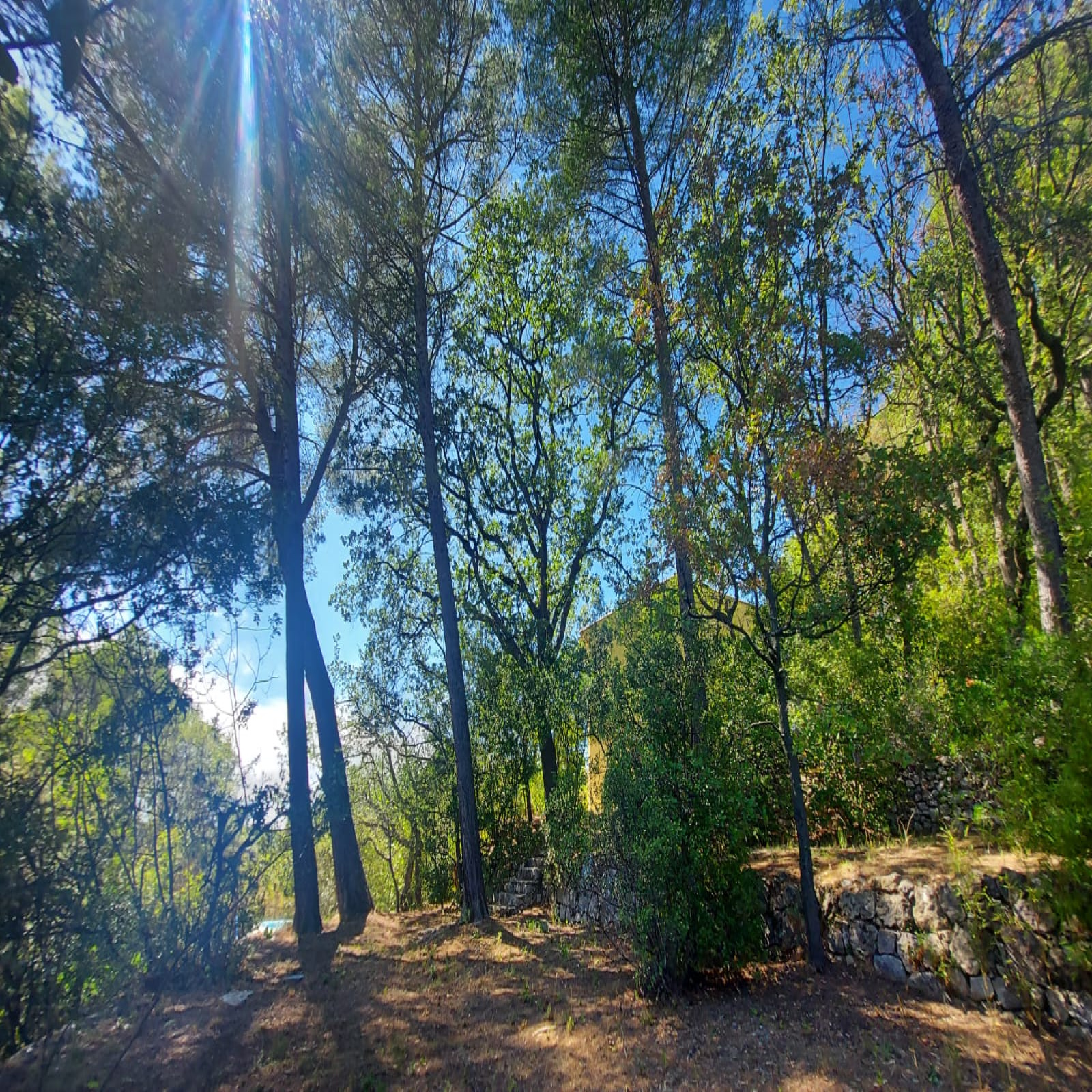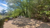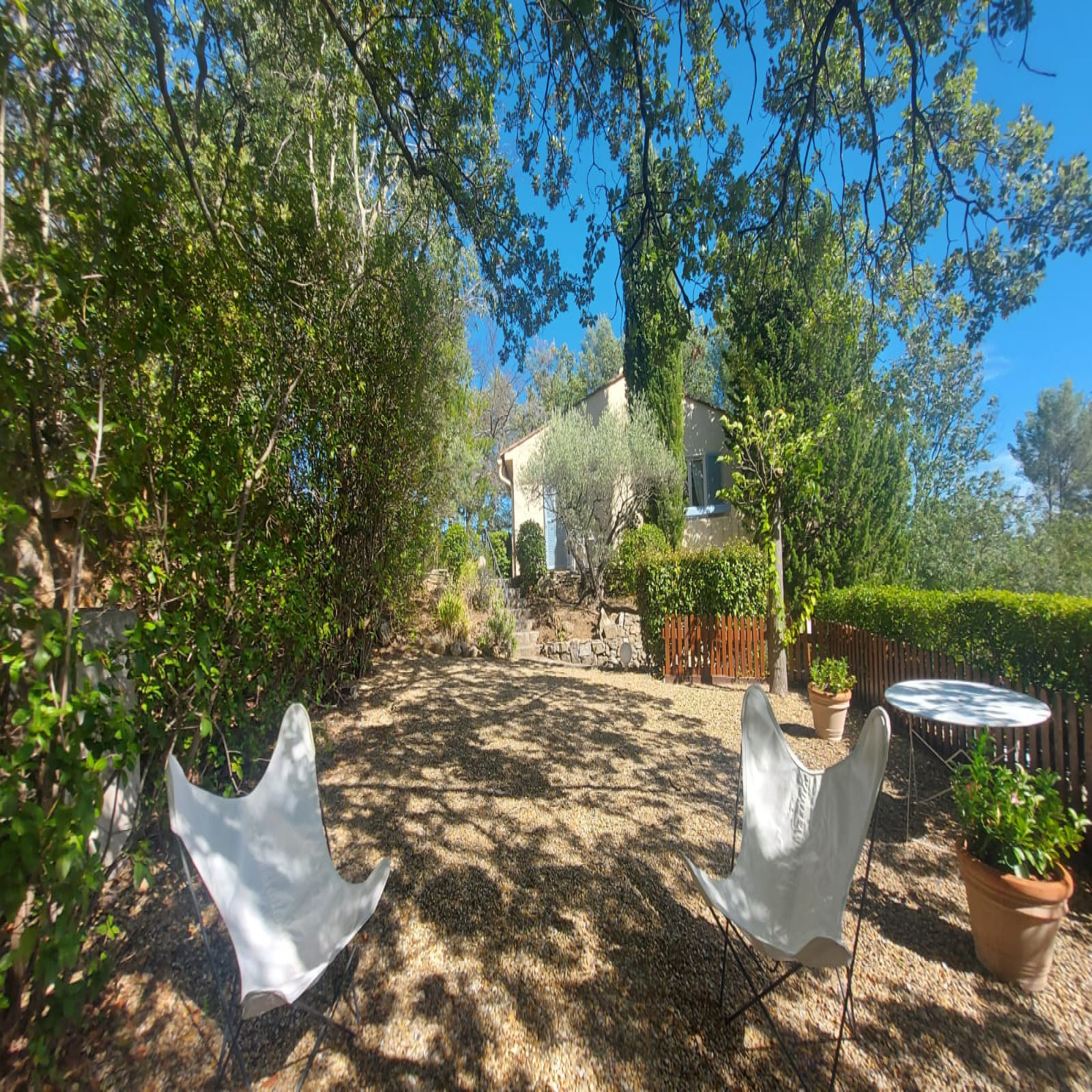 Le jardin très arboré en restanque, propose différents espaces de vie dont un espace piscine.