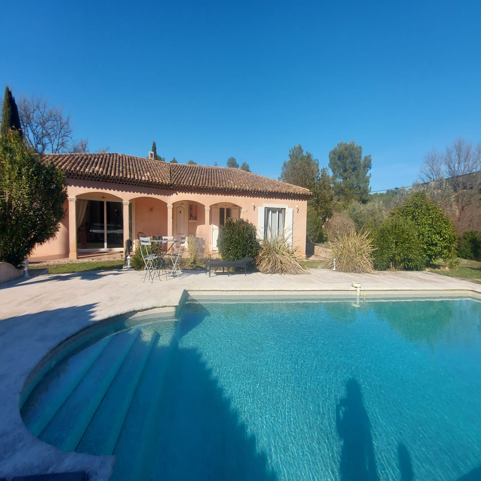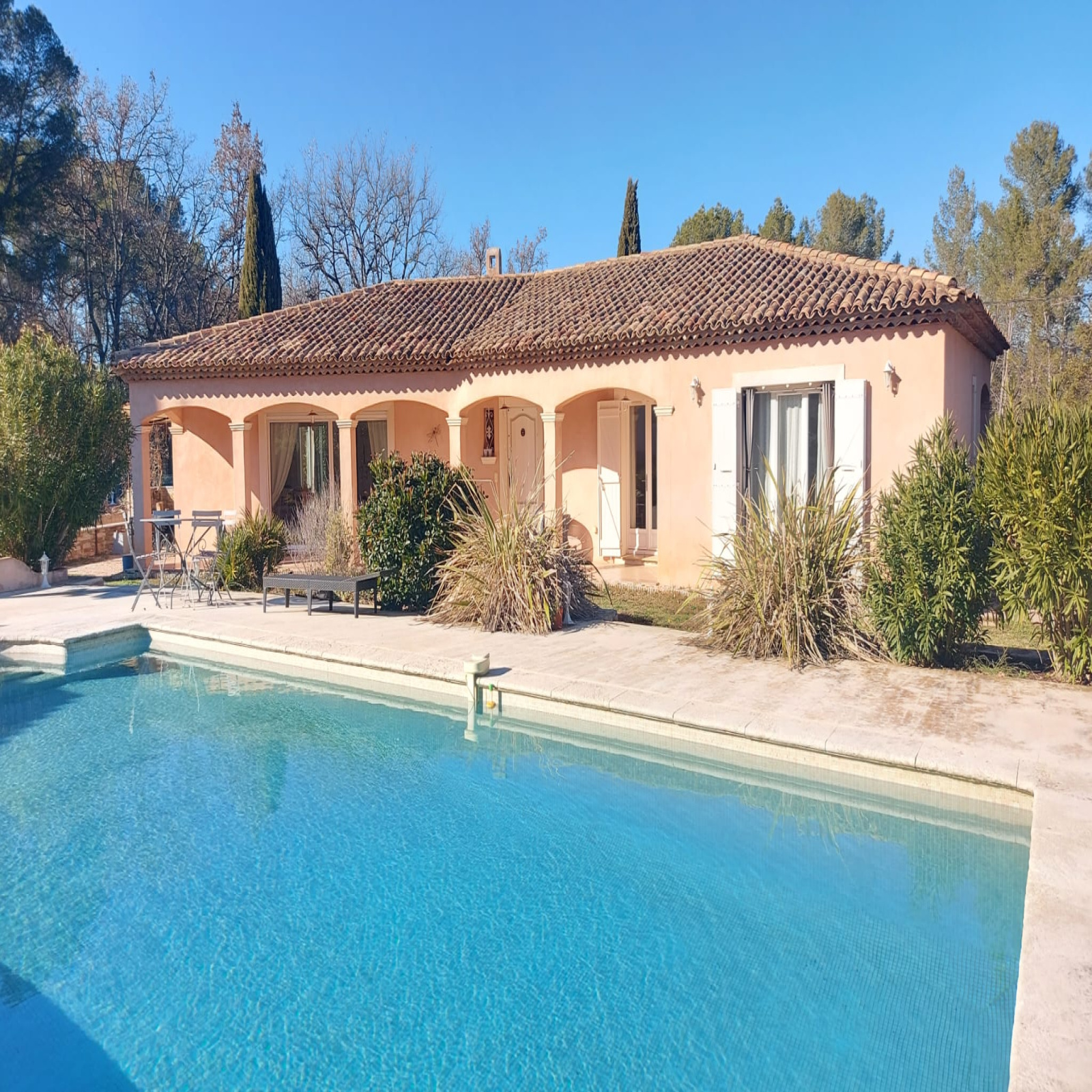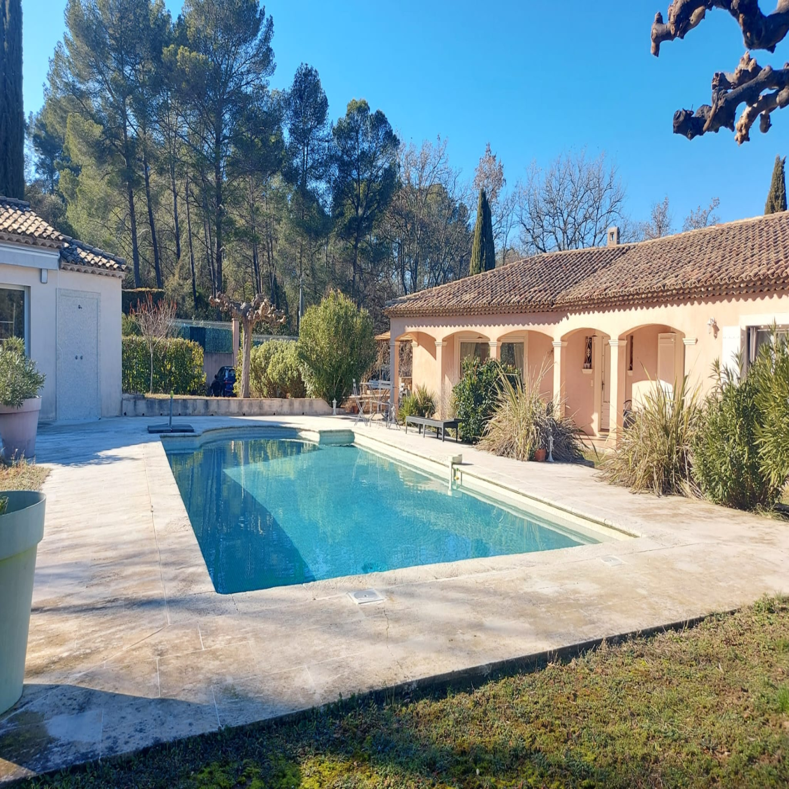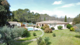 Cette élégante provençale de plain-pied de 170m2 est érigée sur un terrain de 4260m2 où l'on peut découvrir sous un chêne centenaire une jolie bastide en pierres de 40m2 pour loger les amis, une piscine traditionnelle au chlore de 11,5x5,5, de grandes terrasses, une cuisine d'été de 30m2 entièrement équipée avec barbecue et four à pizza, une douche et des toilettes, puis un local technique.