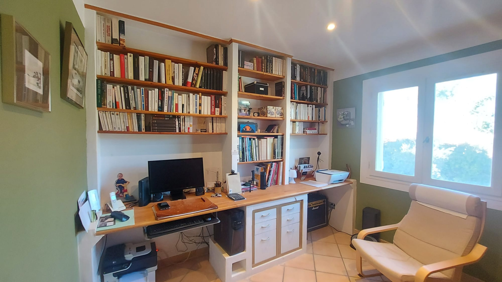 Côté nuit la villa offre 3 chambres avec placard (entre 11 et 18m2), un bureau avec sa bibliothèque, une salle de bains avec douche, une salle d'eau et un second WC.