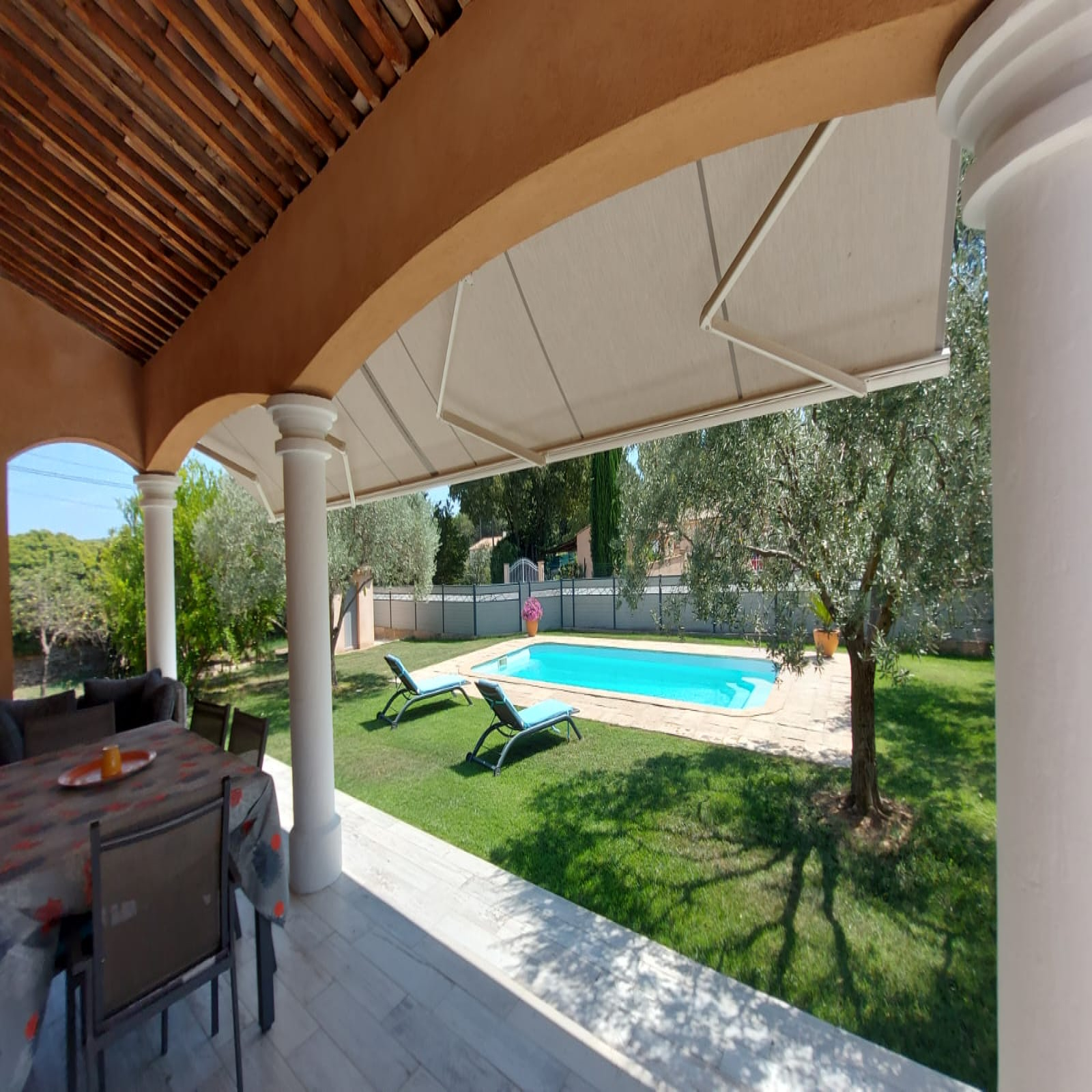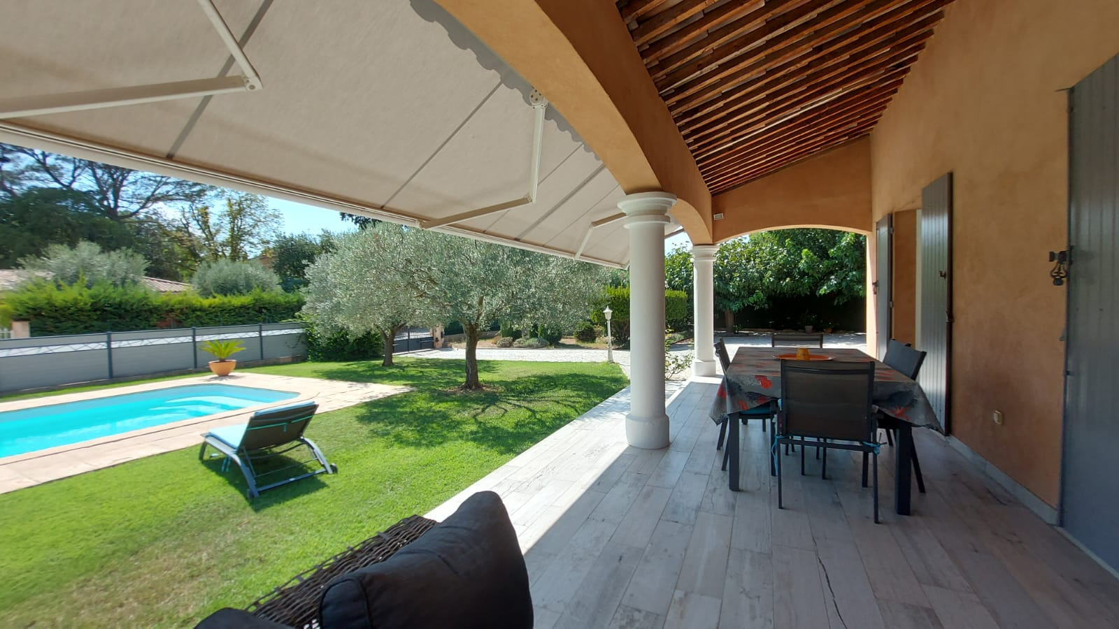 Le jardin est somptueux avec ses cyprès chandelles, ses oliviers, ses fruitiers, son gazon naturel qui enveloppe la jolie piscine 8x4 au brome... Tout en harmonie, le store banne protège et prolonge la terrasse plein sud et vous réservera de bons moments tout au long de l'année.