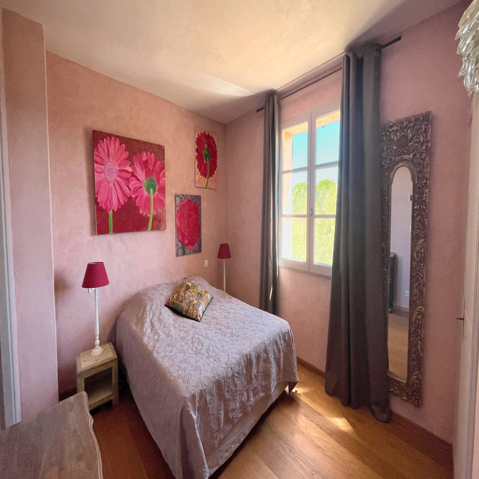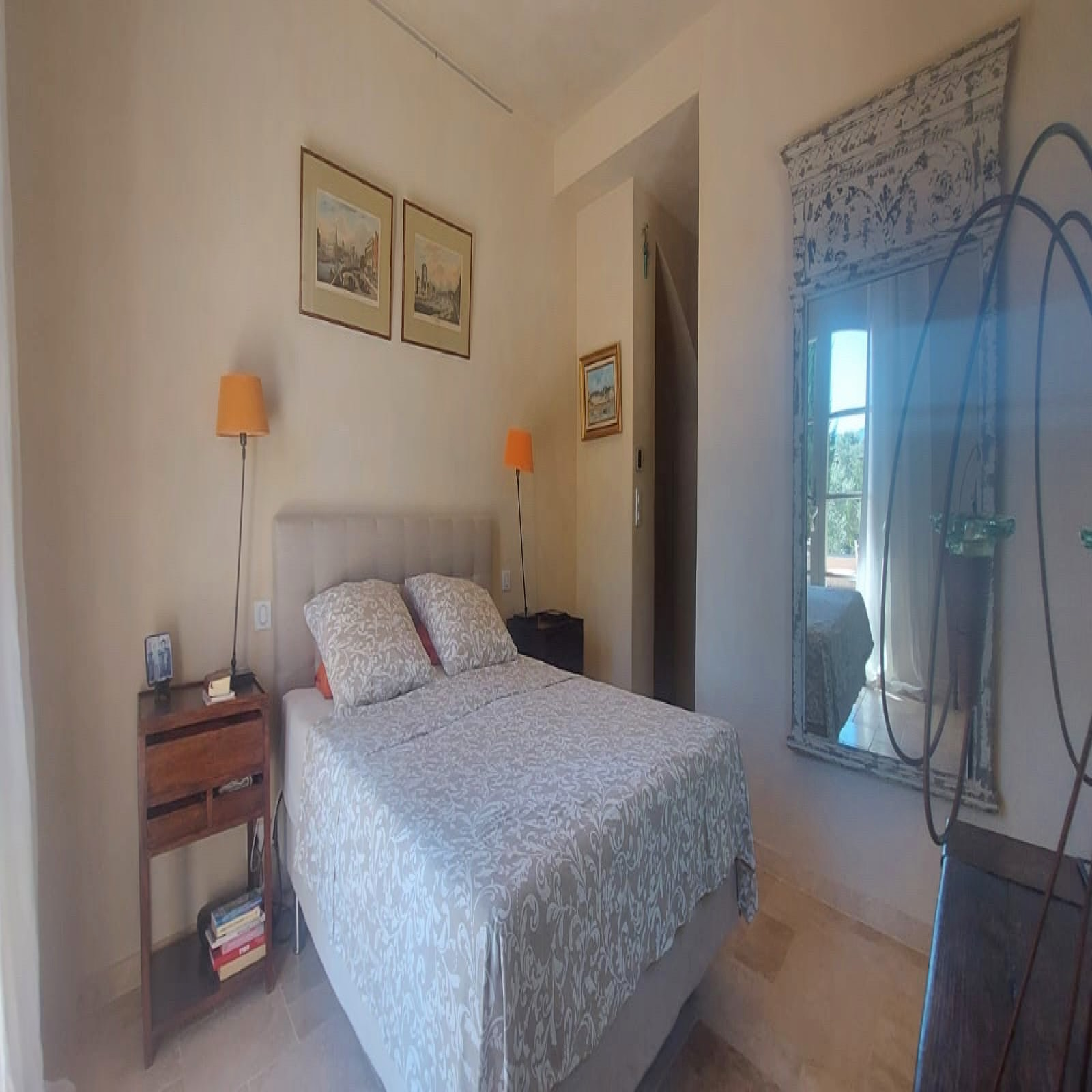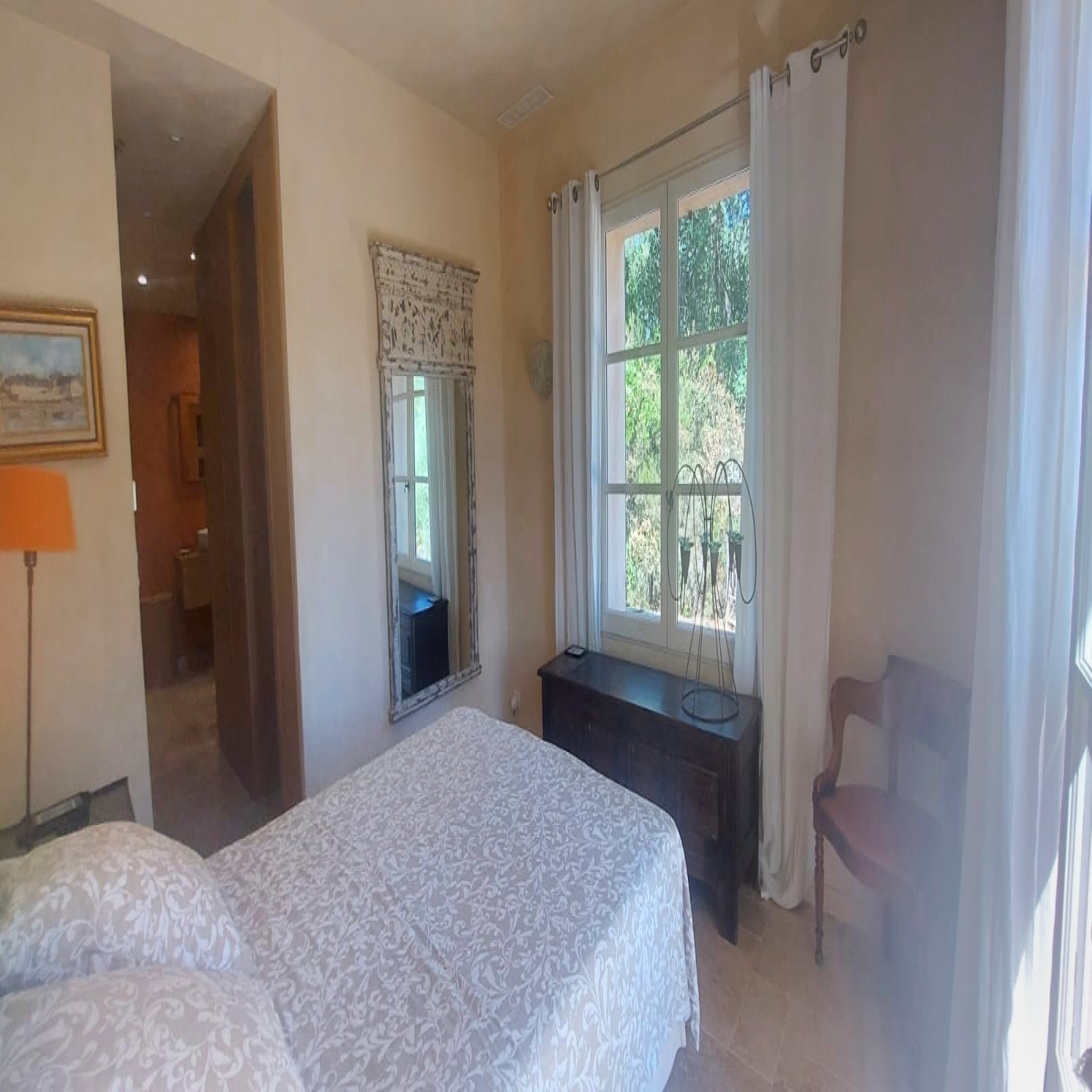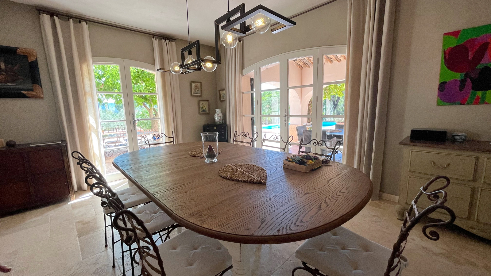 En franchissant le seuil du rez de chaussée, cette entrée distinguée avec placard et WC invités vous accueille chaleureusement, ouvrant la voie à un séjour salon baigné de lumière naturelle. La bastide bénéficie d'une grande cuisine dinatoire fonctionnelle et indépendante entièrement équipée autour de son piano Lacanche s'ouvrant sur une verrière accueillant un espace salon parfaitement dédié à la détente. Cette verrière permet une vue panoramique exceptionnelle sur la piscine scintillante, l'oliveraie et les majestueux pins parasols, créant ainsi un cadre idéal pour se relaxer.