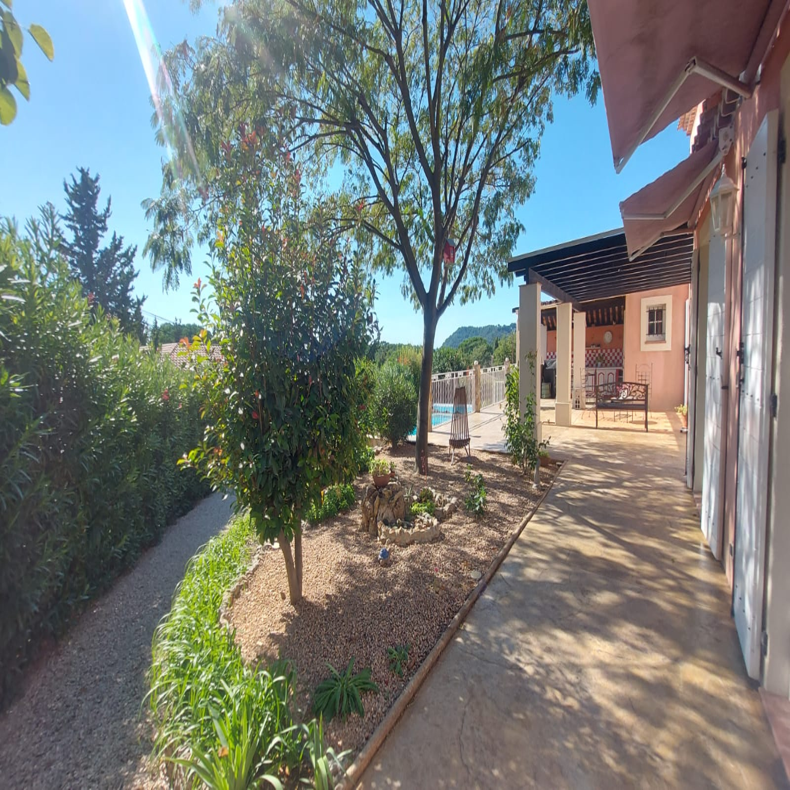 Extender Immobilier présente une élégante villa au charme néo-provençal de 145m2 plein Sud sur un parcelle complantée de 1200m2 au calme absolu à 5 minutes du centre de Vidauban.