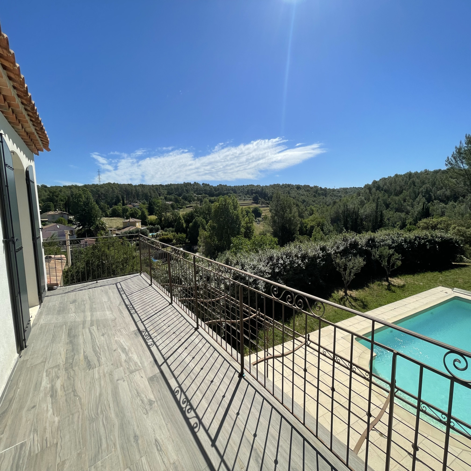 A l’étage , 3 chambres avec une salle de bains et une douche une magnifique terrasse refaite sur laquelle on surplombe la piscine et une vue dégagée sur la forêt.