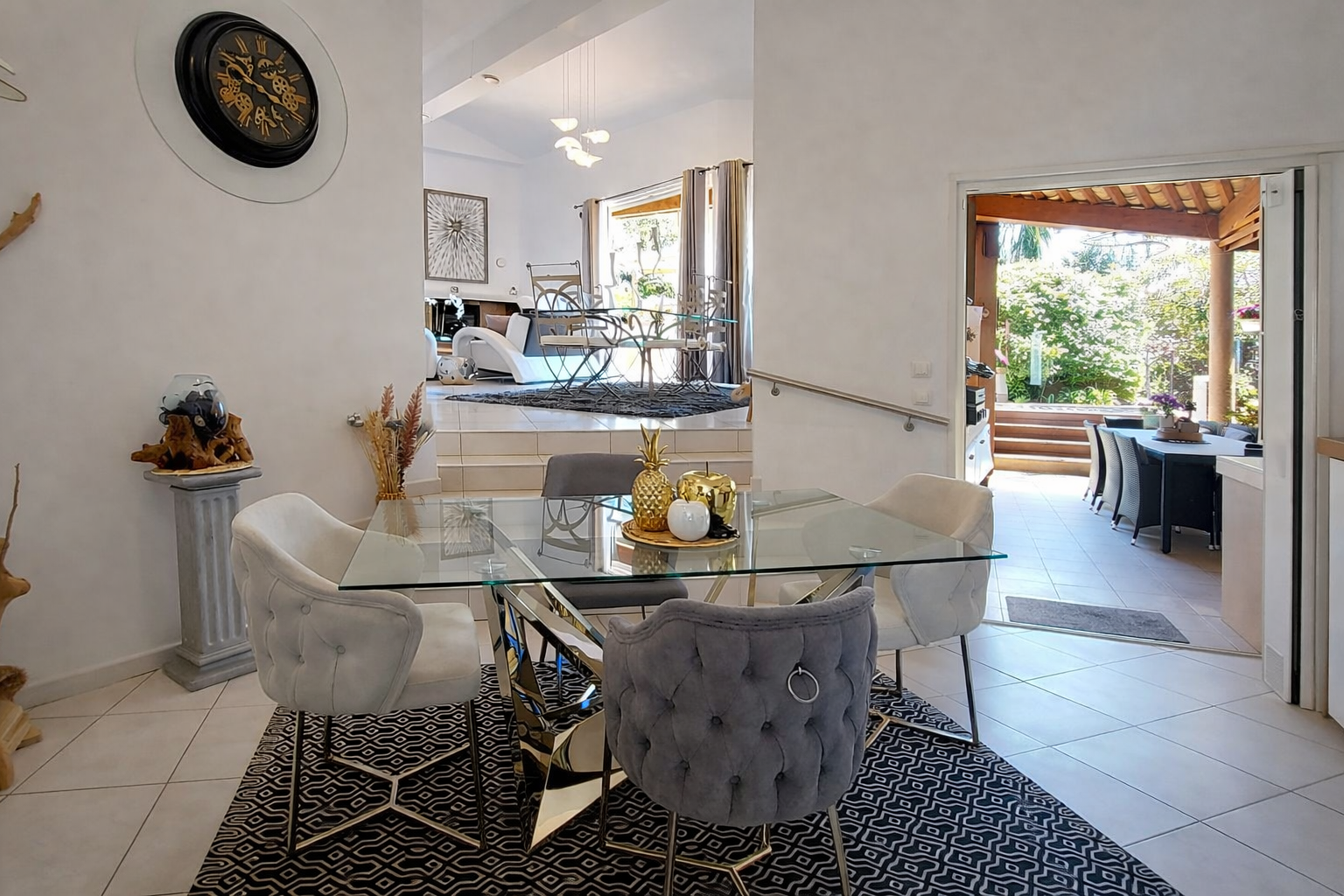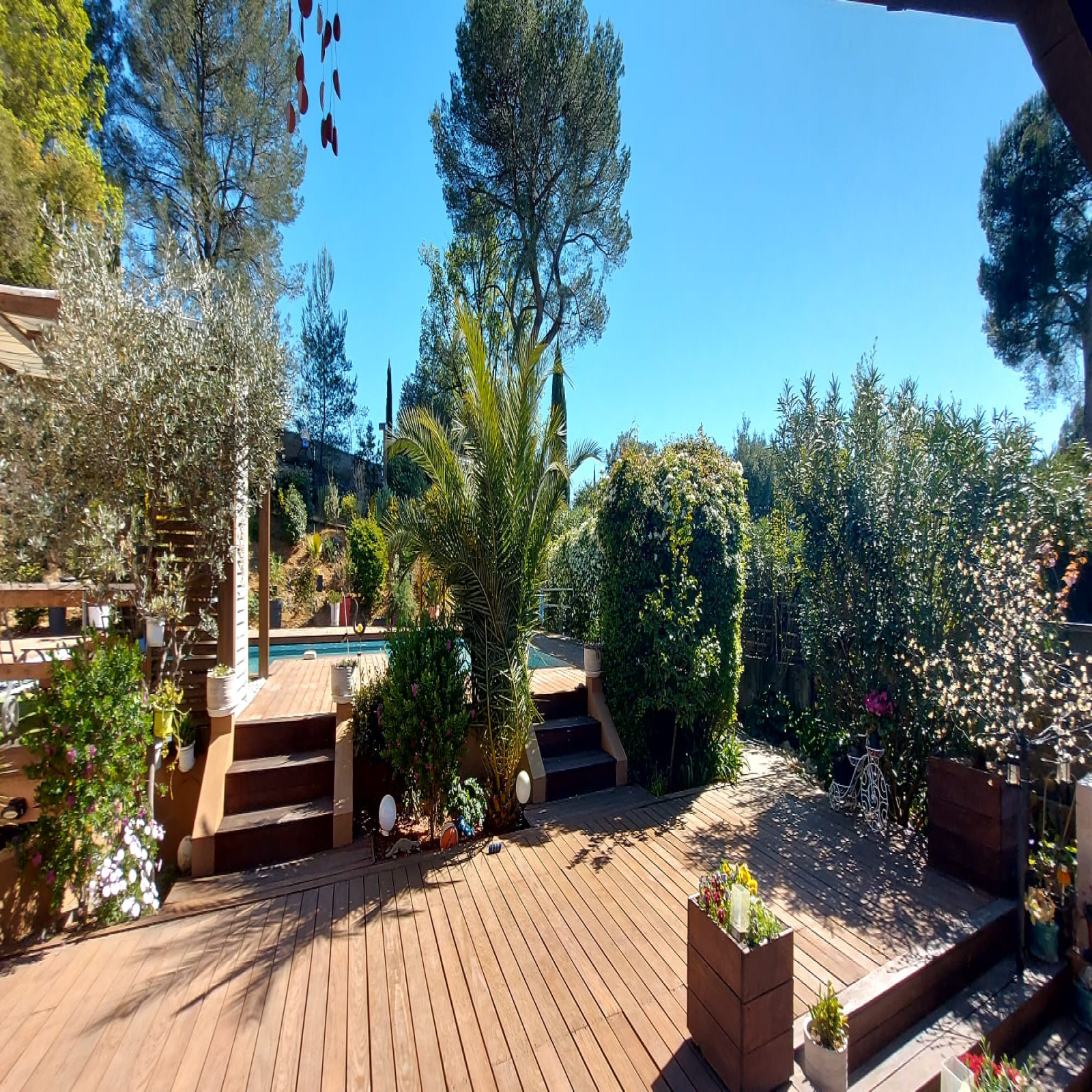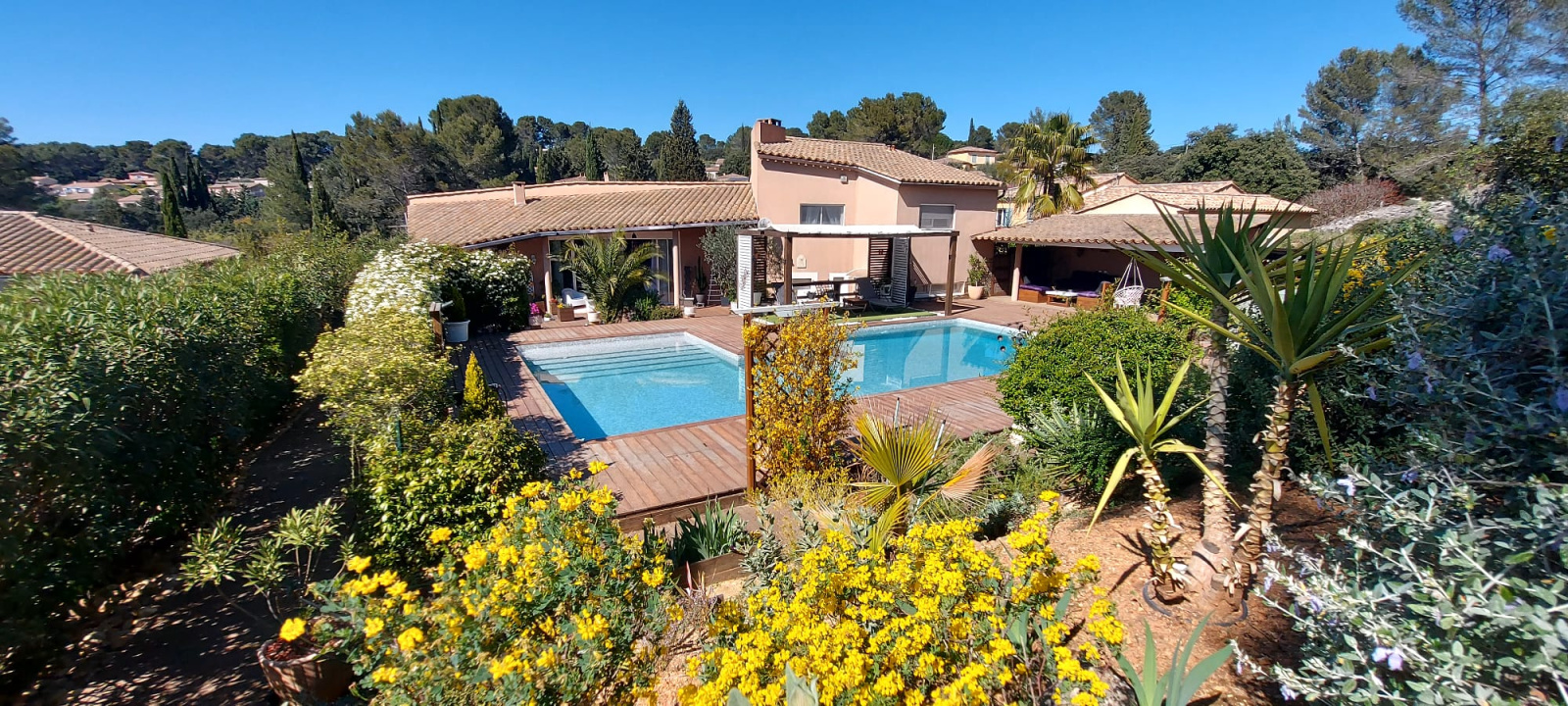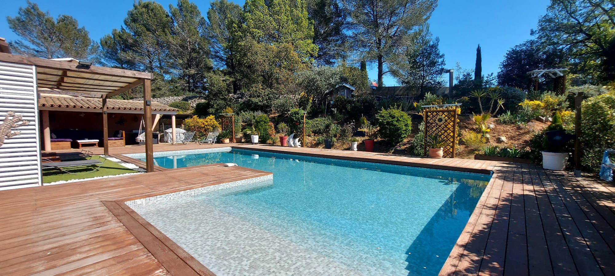 A l'extérieur, le temps s'arrête sur ce jardin parfaitement paysagé, ces belles terrasses en teck qui enveloppent une piscine en forme libre.