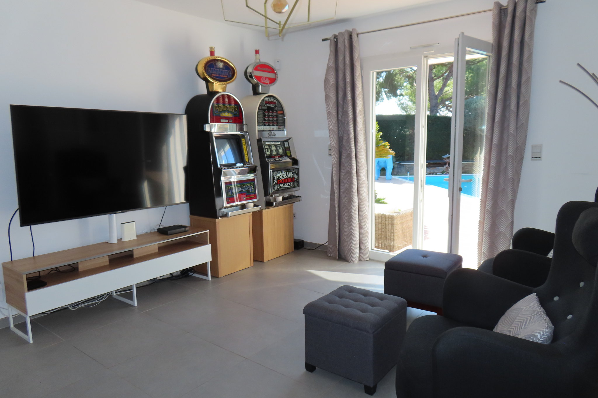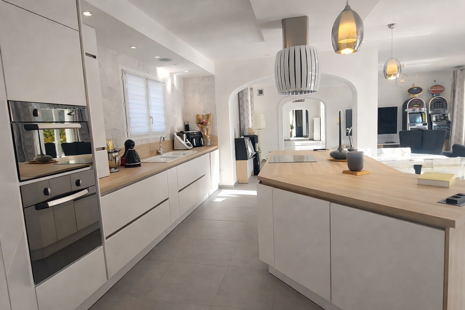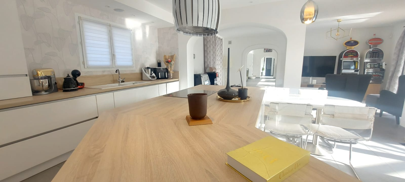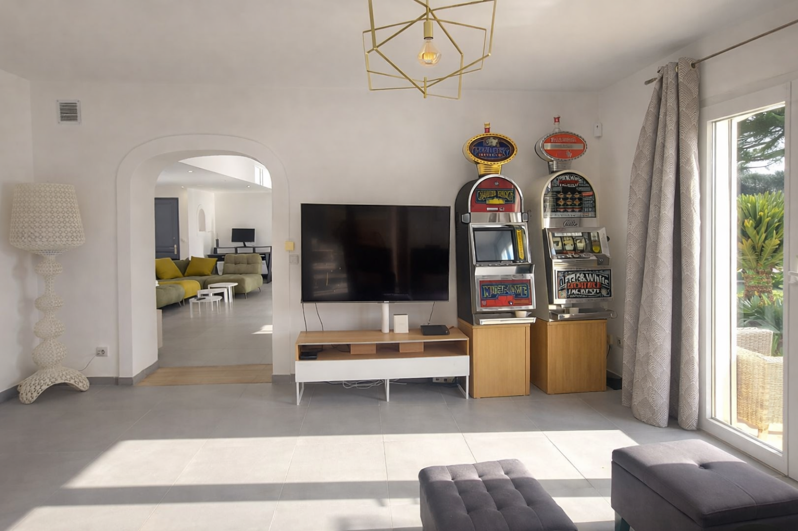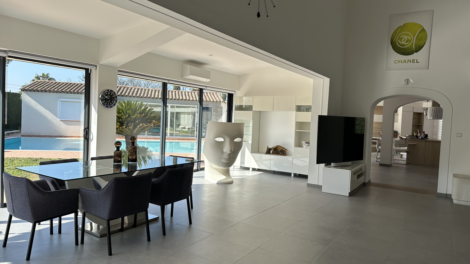 Dès l'entrée, la villa se distingue par sa luminosité, ainsi que son incroyable pièce de vie avec salon cathédrale, une cuisine entièrement aménagée et équipée par des matériaux haut de gamme, un coin télé totalisant 122 M2. Une mezzanine à l'étage a été aménagée en espace bureau de 16 M2 et pouvant être aisément transformée en chambre. Côté nuit, sur chacune des ailes de la maison se trouvent deux suites parentales de 30 et 47 m2 avec dressing, salle d'eau. Une véranda a été aménagée avec son spa et pouvant servir de 4 eme chambre.