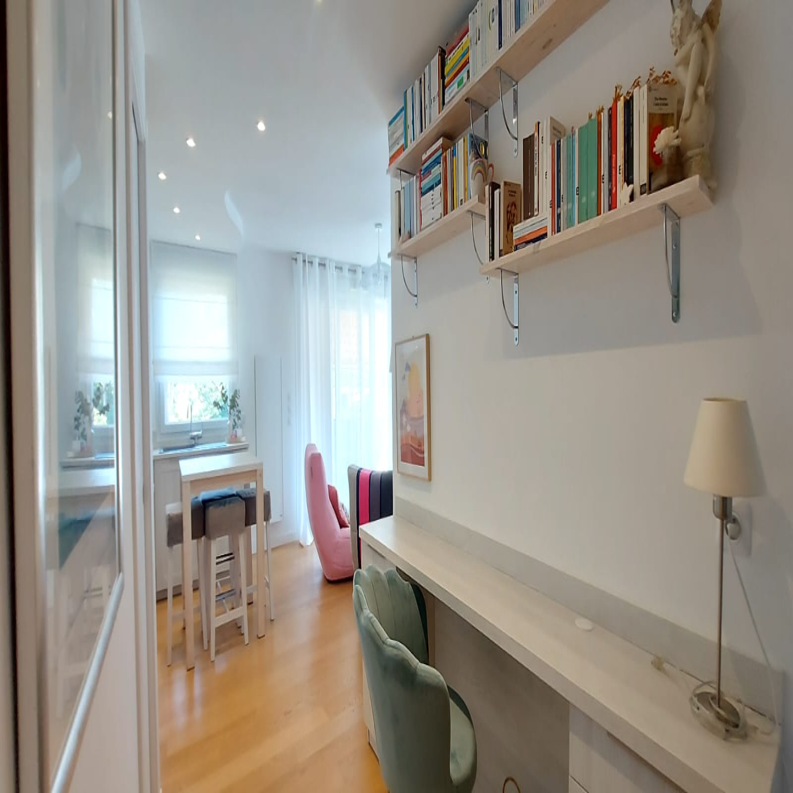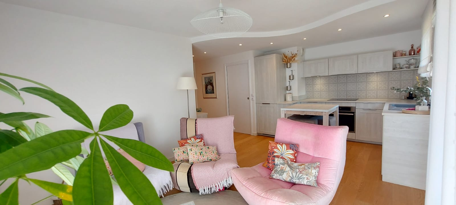 L'appartement est composé d'une entrée, un wc suspendu entièrement faïencé, un espace bureau, deux chambres de 9/10 m2 dont l'une avec placard, une superbe salle d'eau, une pièce de vie d'environ 30m2 avec séjour/salon et cuisine parfaitement équipée ouverte, un rangement puis un balcon d'angle de 12m2.
