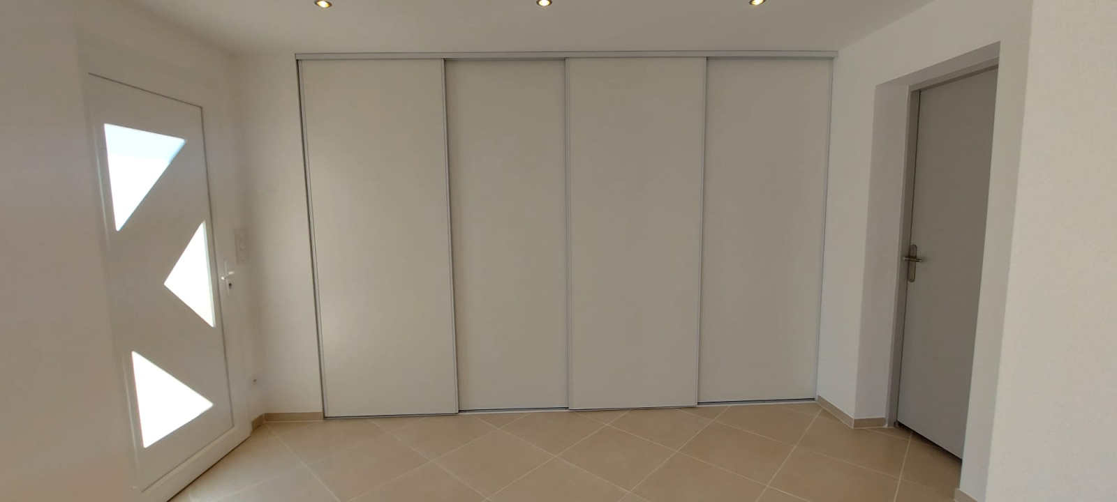 La villa plein Sud est composée d'une entrée avec de rangements, une buanderie, un double séjour salon traversant de 44m2 baigné de lumière puis une cuisine équipée ouverte.