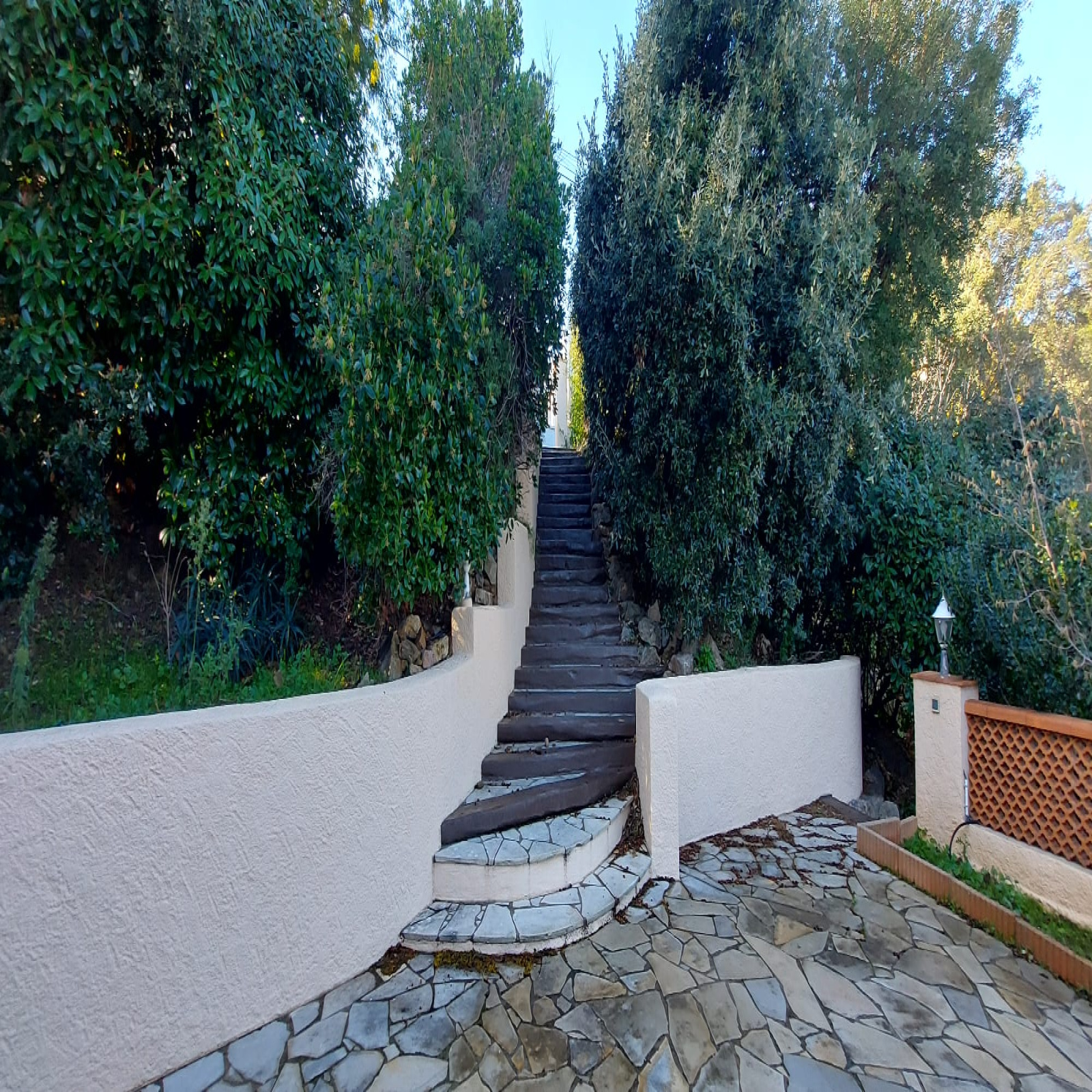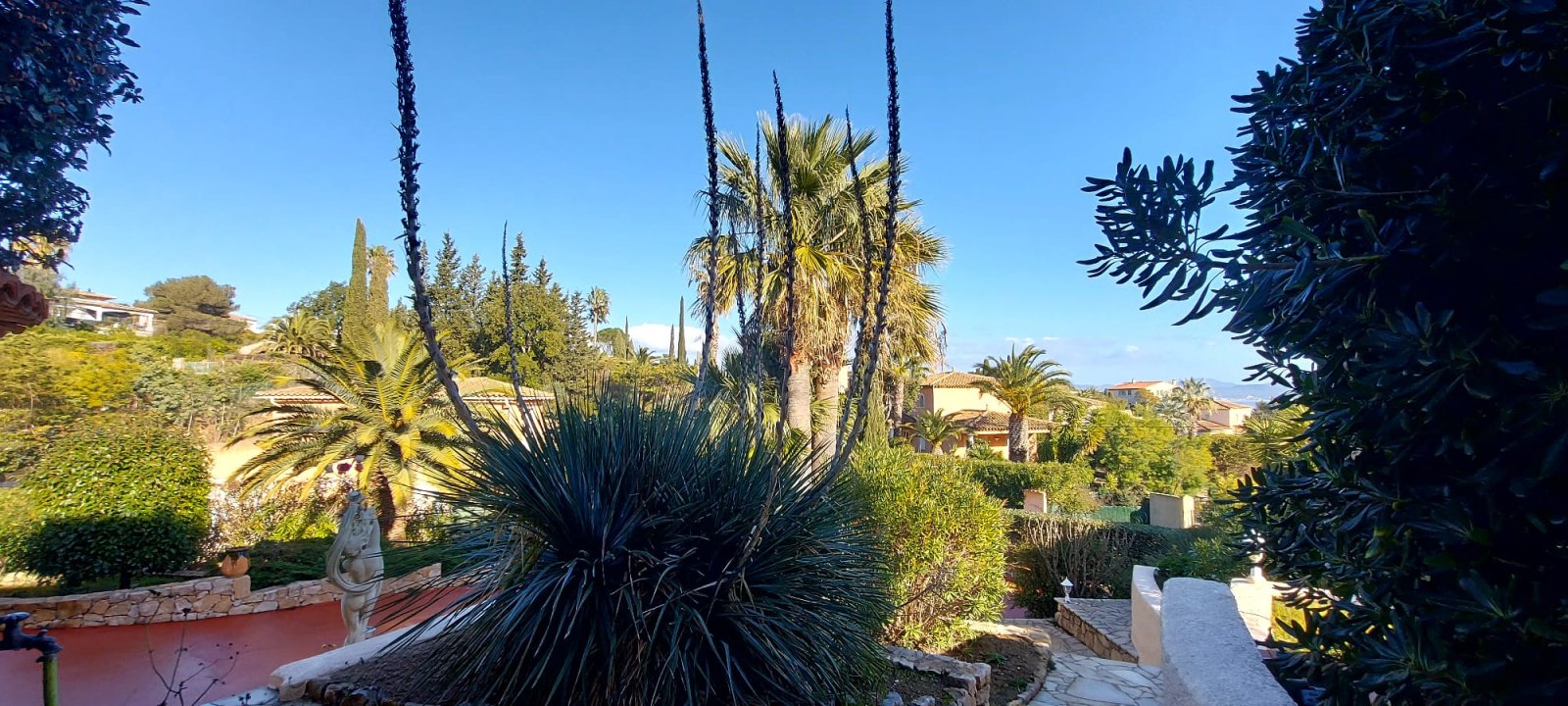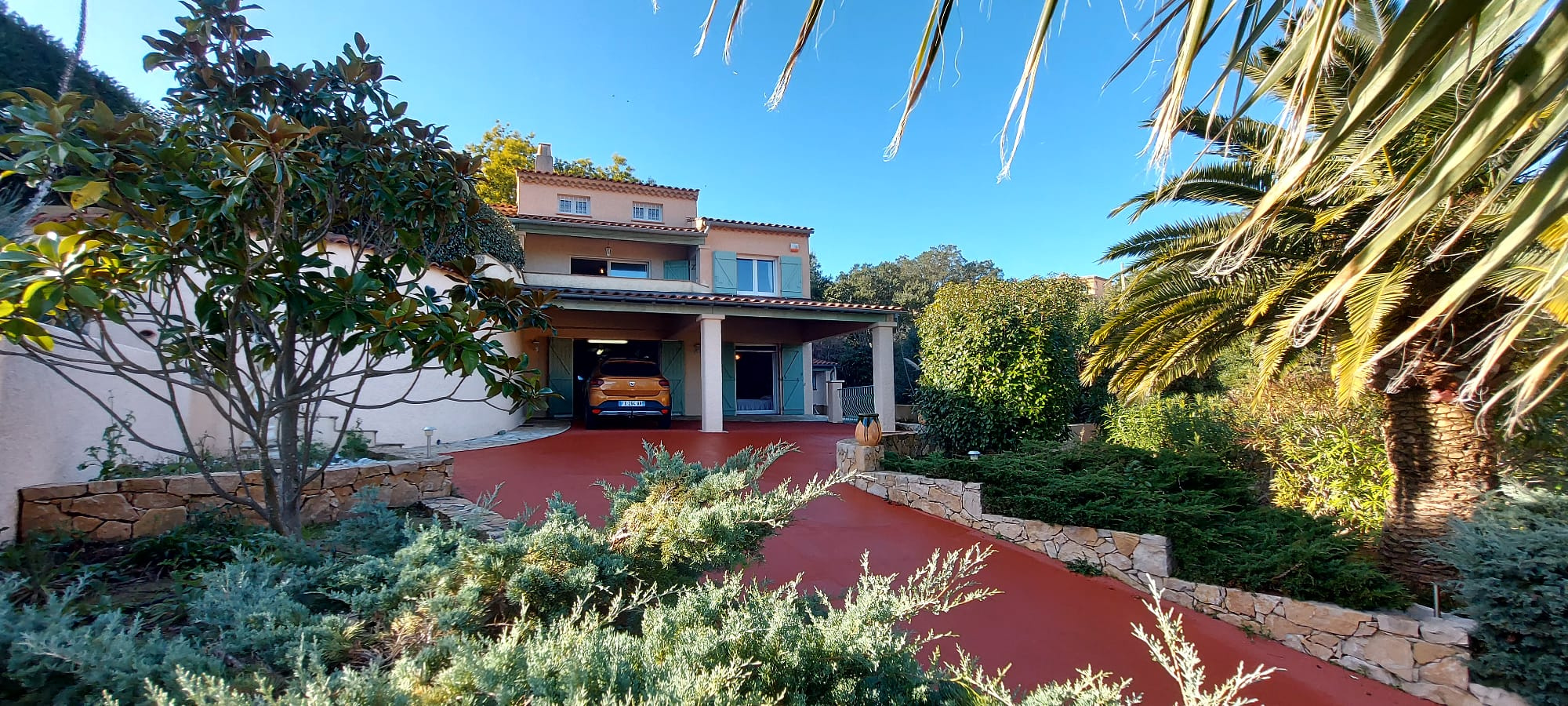 Vous serez accueillis par des jardins luxuriants, un oasis de palmiers, des essences méditerranéennes, une belle allée en résine rouge, des murets en pierres, un bassin d'eau ... sur une parcelle de 1135m2 entièrement clôturée.